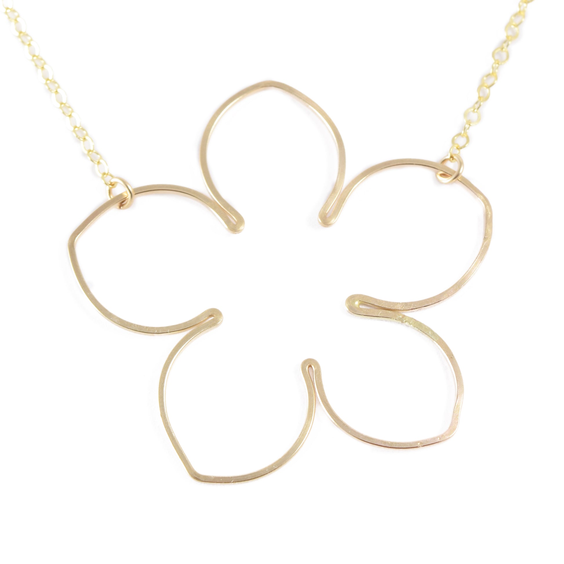 With a stunning open flower pendant, the blossom necklace is a beautiful balance between bold and delicate. The blossom measures almost 1-1/2 inches wide and is completely handcrafted of 14K gold-filled wire. Cable chain is available in 16, 18 or 20 inches.