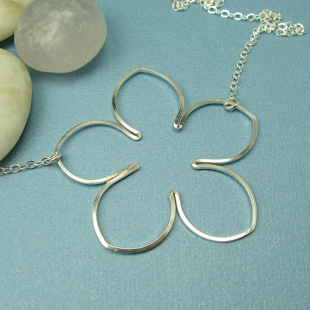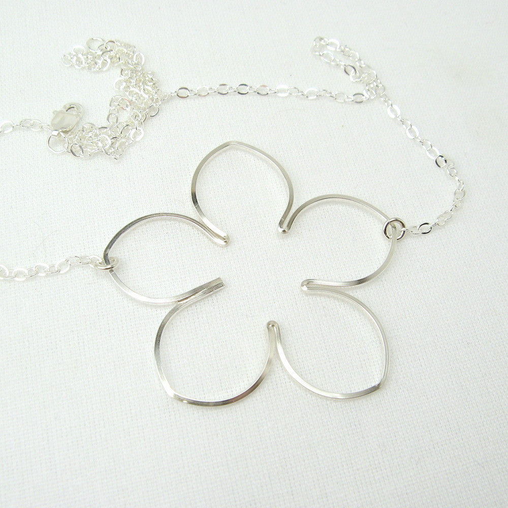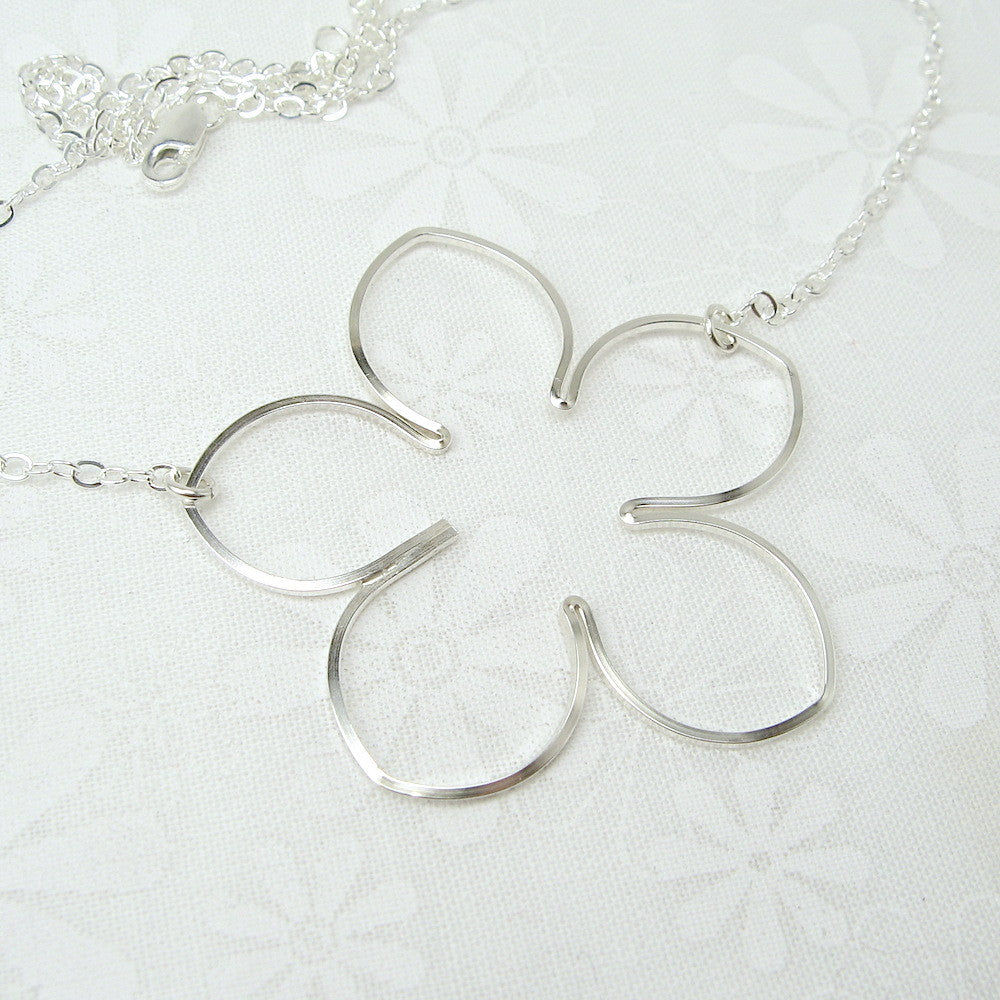 With a stunning open flower centerpiece, the blossom necklace holds a beautiful balance between bold and delicate. The blossom measures almost 1-1/2 inches wide and is completely handcrafted of sterling silver wire. Cable chain is available in 16, 18 or 20 inches.