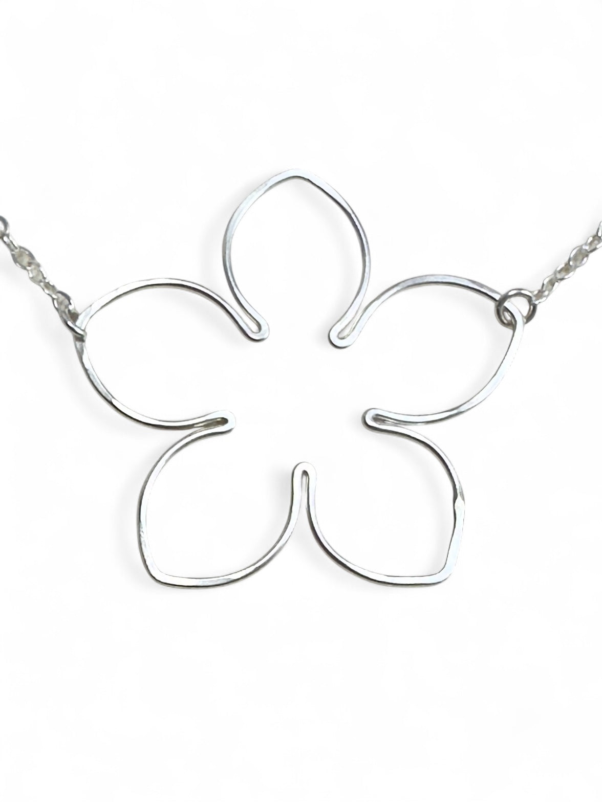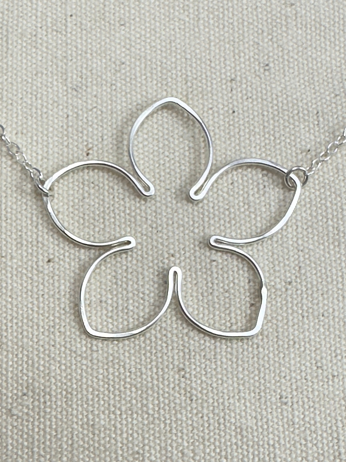 With a stunning open flower centerpiece, the blossom necklace holds a beautiful balance between bold and delicate. The blossom measures almost 1-1/2 inches wide and is completely handcrafted of sterling silver wire. Cable chain is available in 16, 18 or 20 inches.