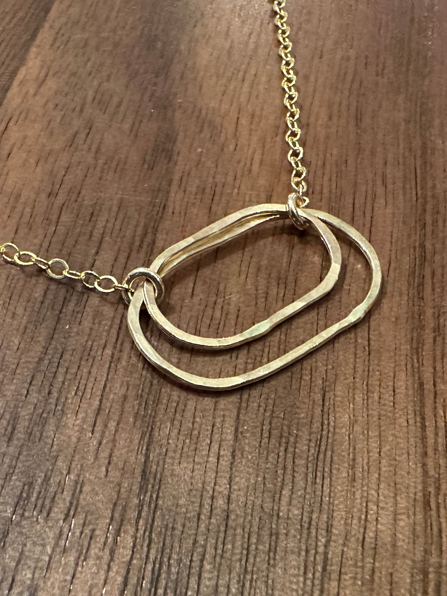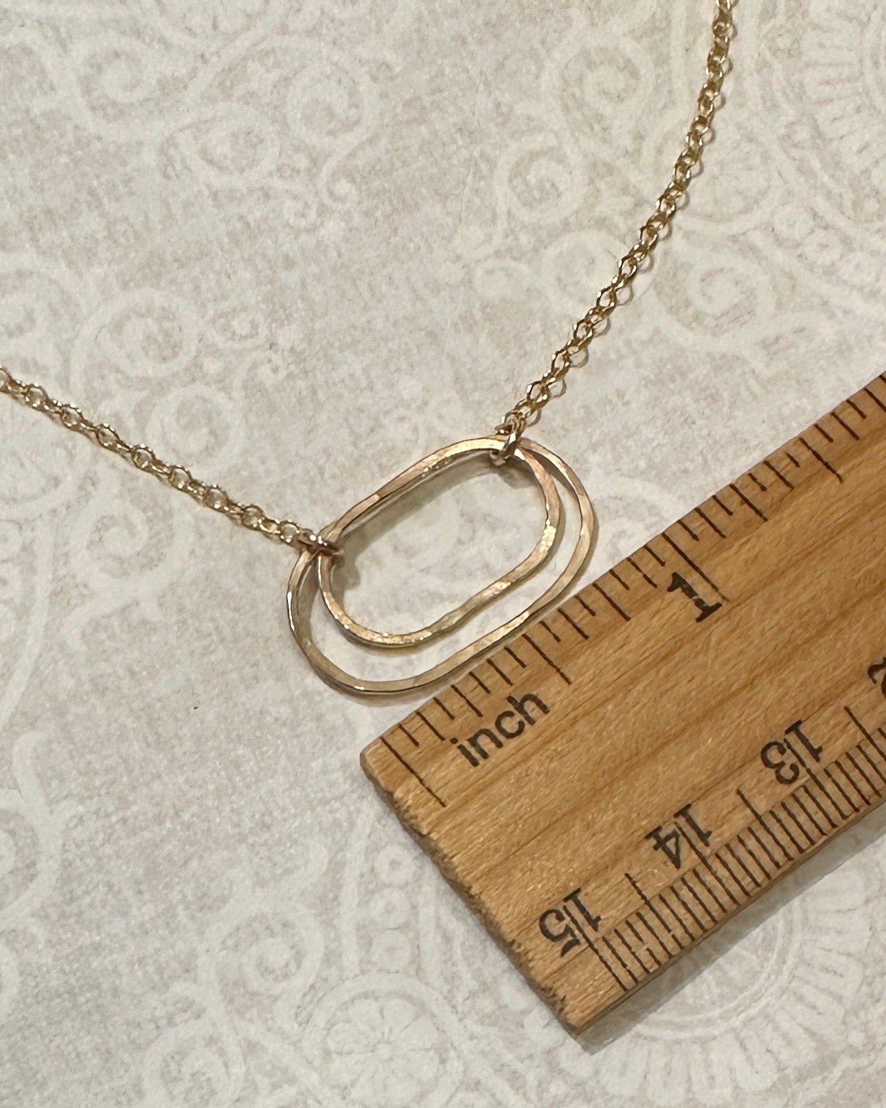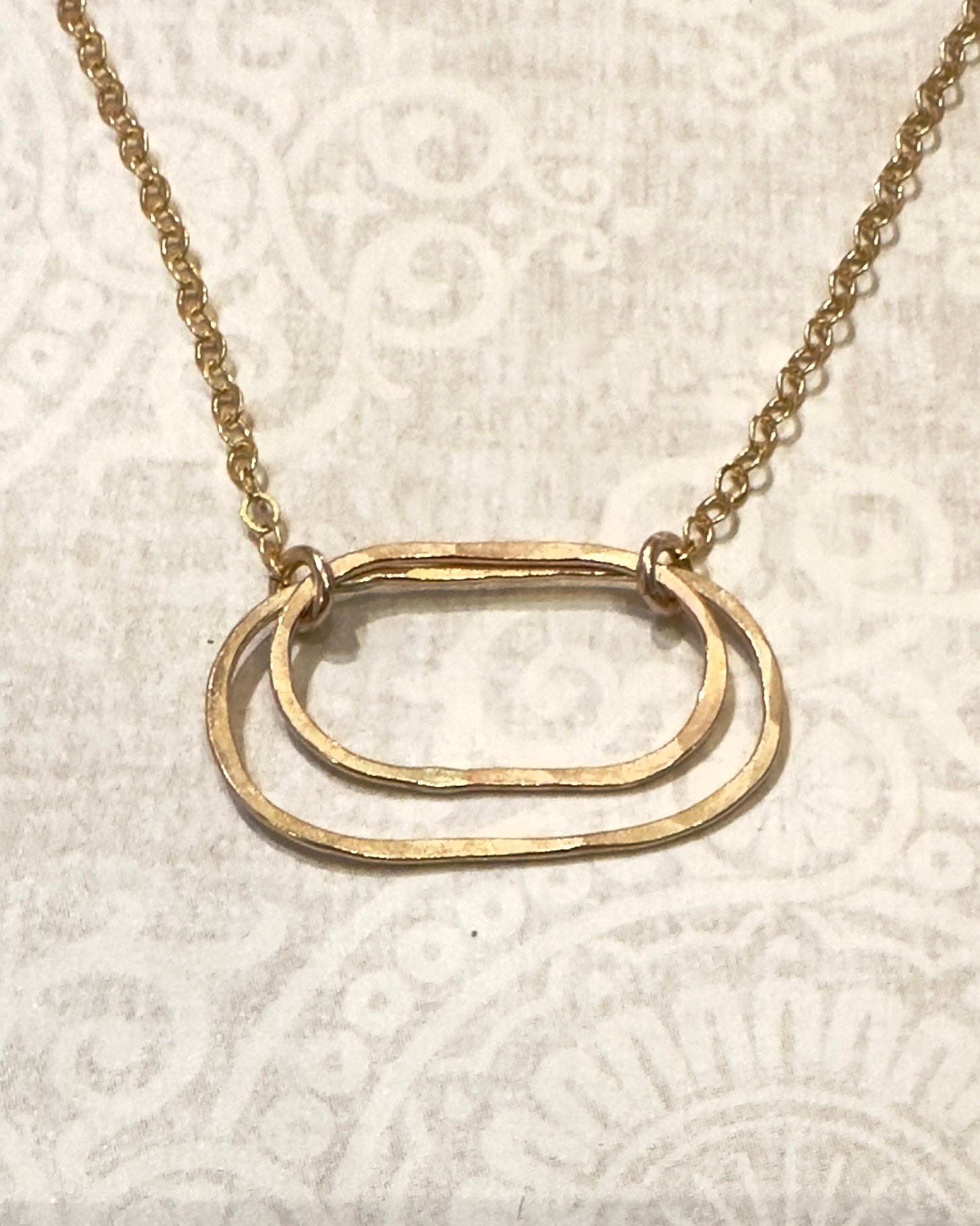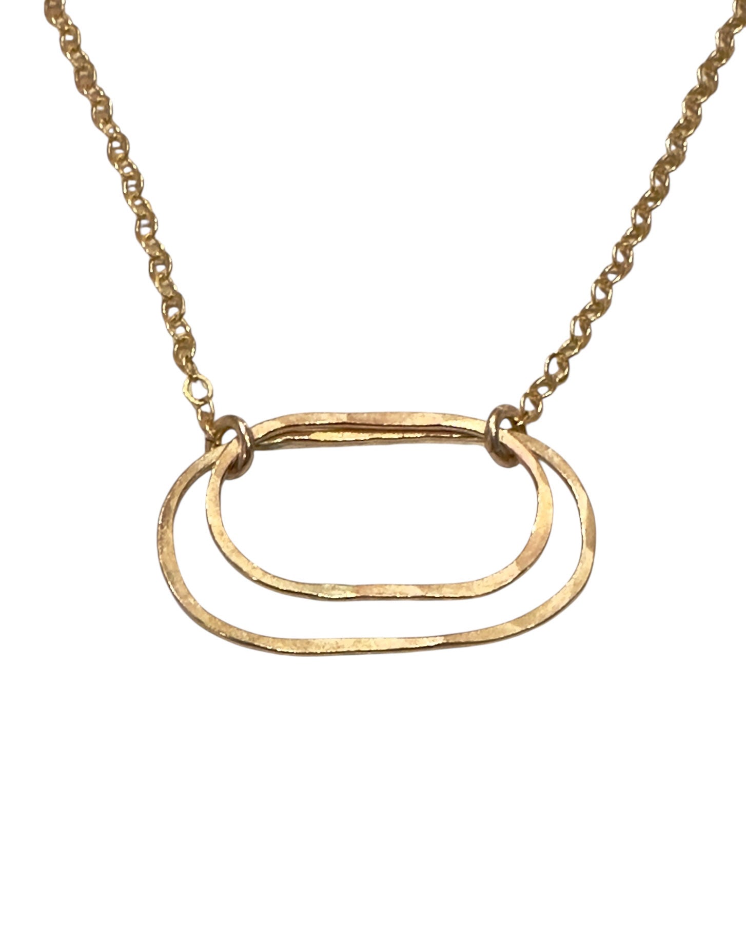 Inspired by the shape of a derby horse race track, the Derby Necklace in 14K gold-filled features two concentric ovals—one larger at 1" x ⅝"—linked together for a modern, minimal look. Each oval is hand-formed from delicate wire and lightly hammered for a subtle shimmer.