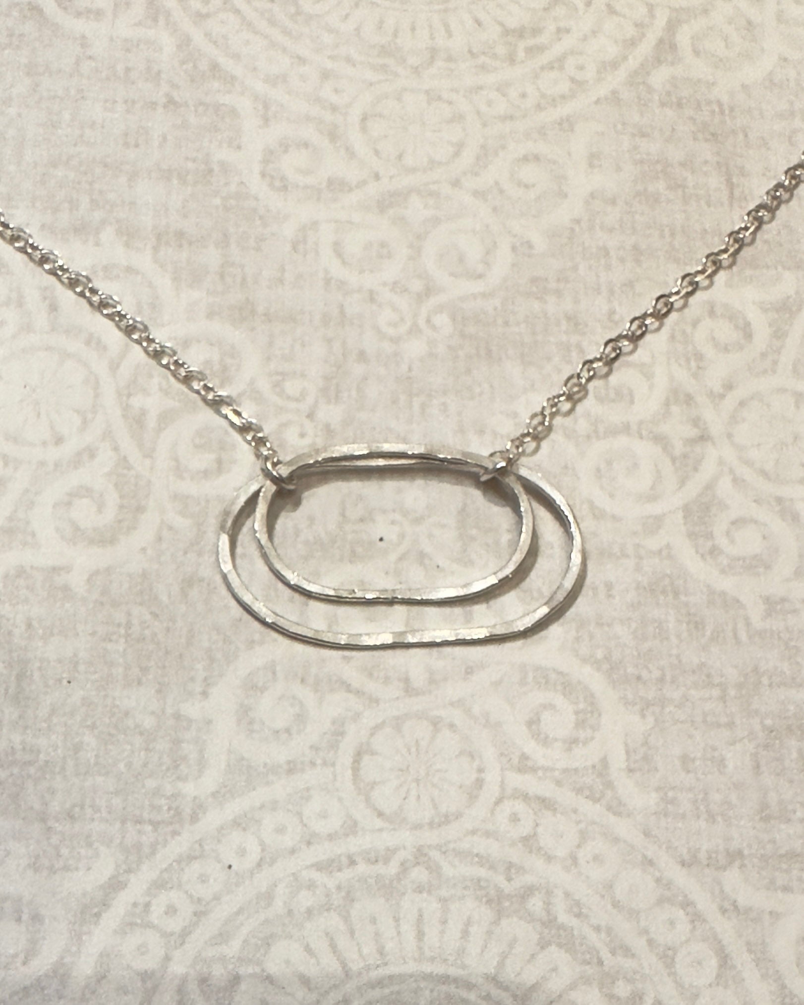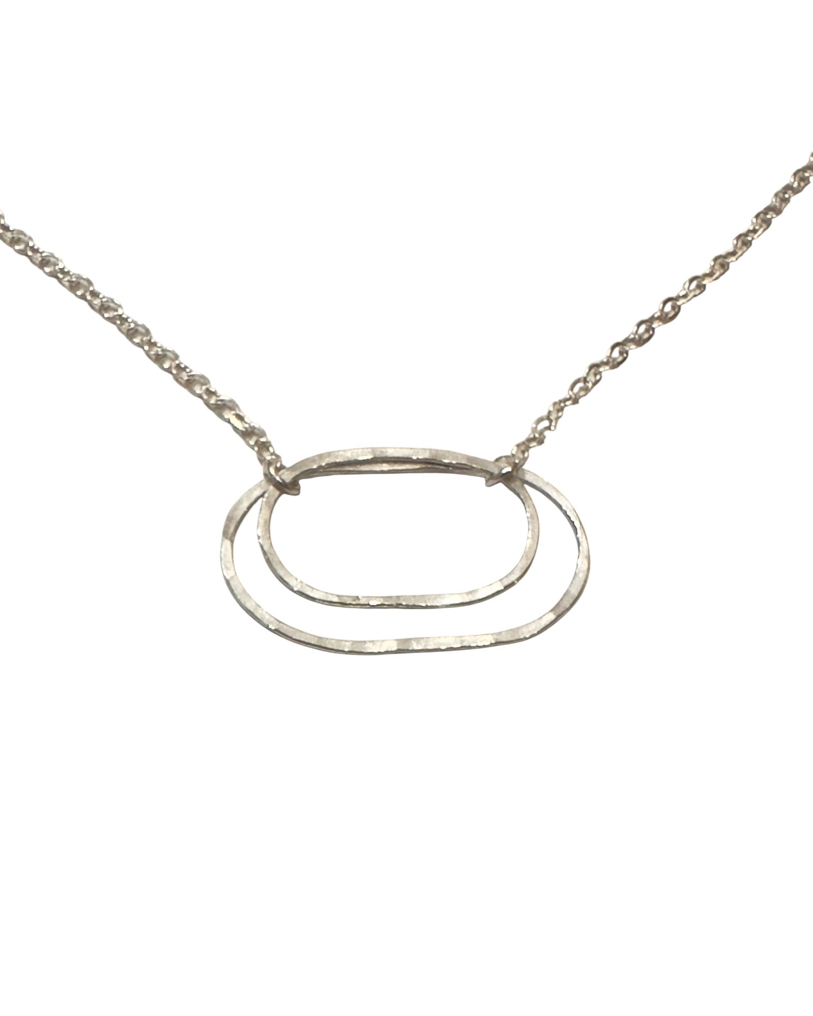 Inspired by the shape of a derby horse race track, the Derby Necklace in sterling silver features two concentric ovals—one larger at 1" x ⅝"—linked together for a modern, minimal look. Each oval is hand-formed from delicate wire and lightly hammered for a subtle shimmer.