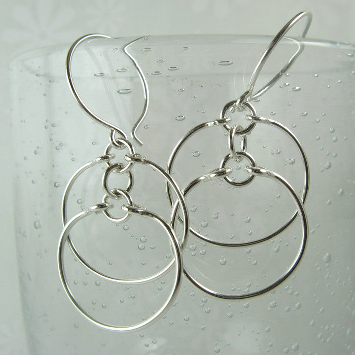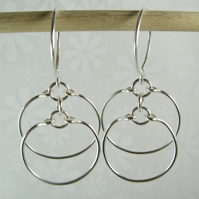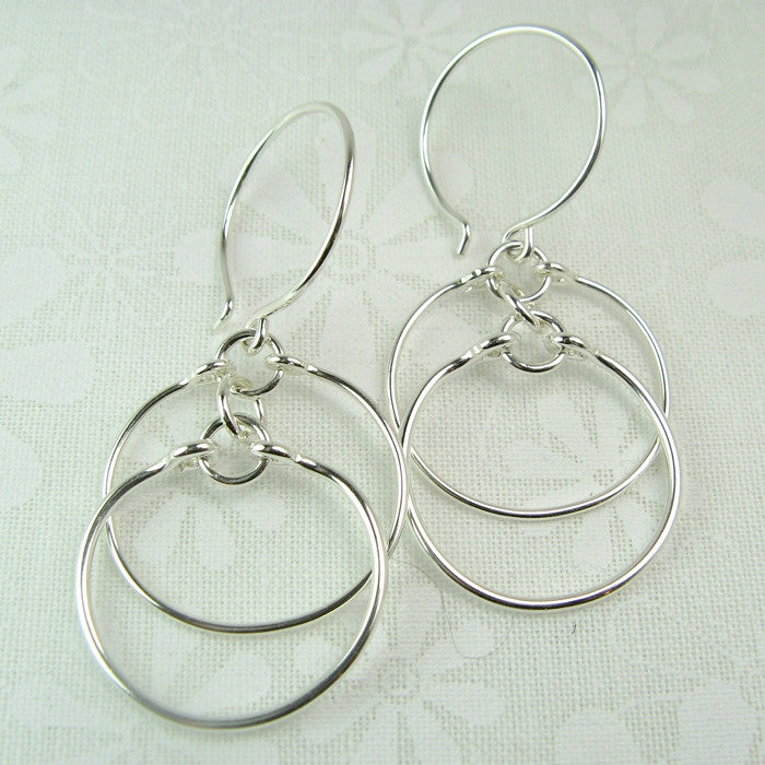 Crafted of different types of wire, the double circles in this design have a heavier look with lots of movement, yet are still very lightweight. Made of sterling silver, they hang 1-3/4 inches (4.5 cm) in length and the diameter of the circles is about 5/8" (~1.5 cm).