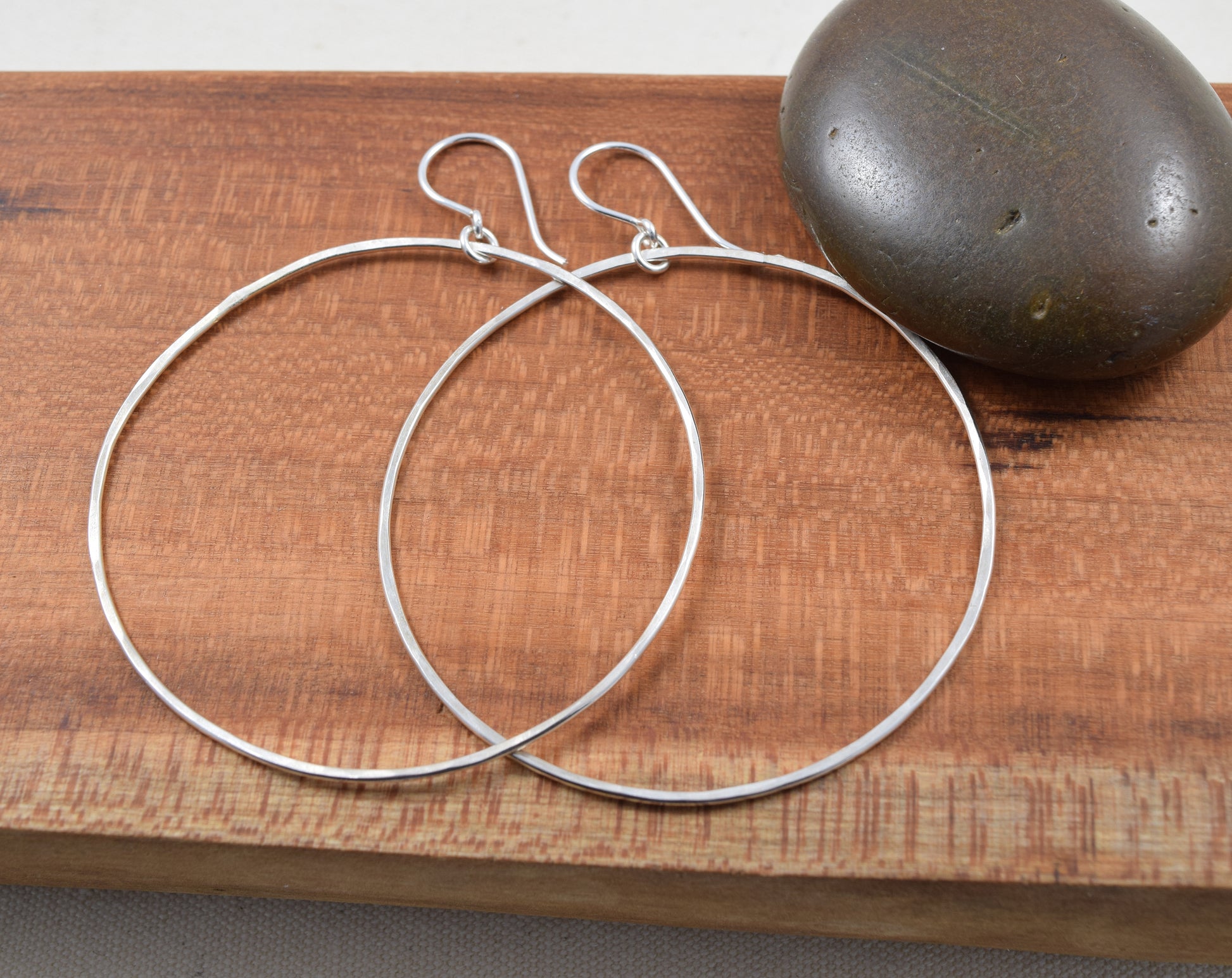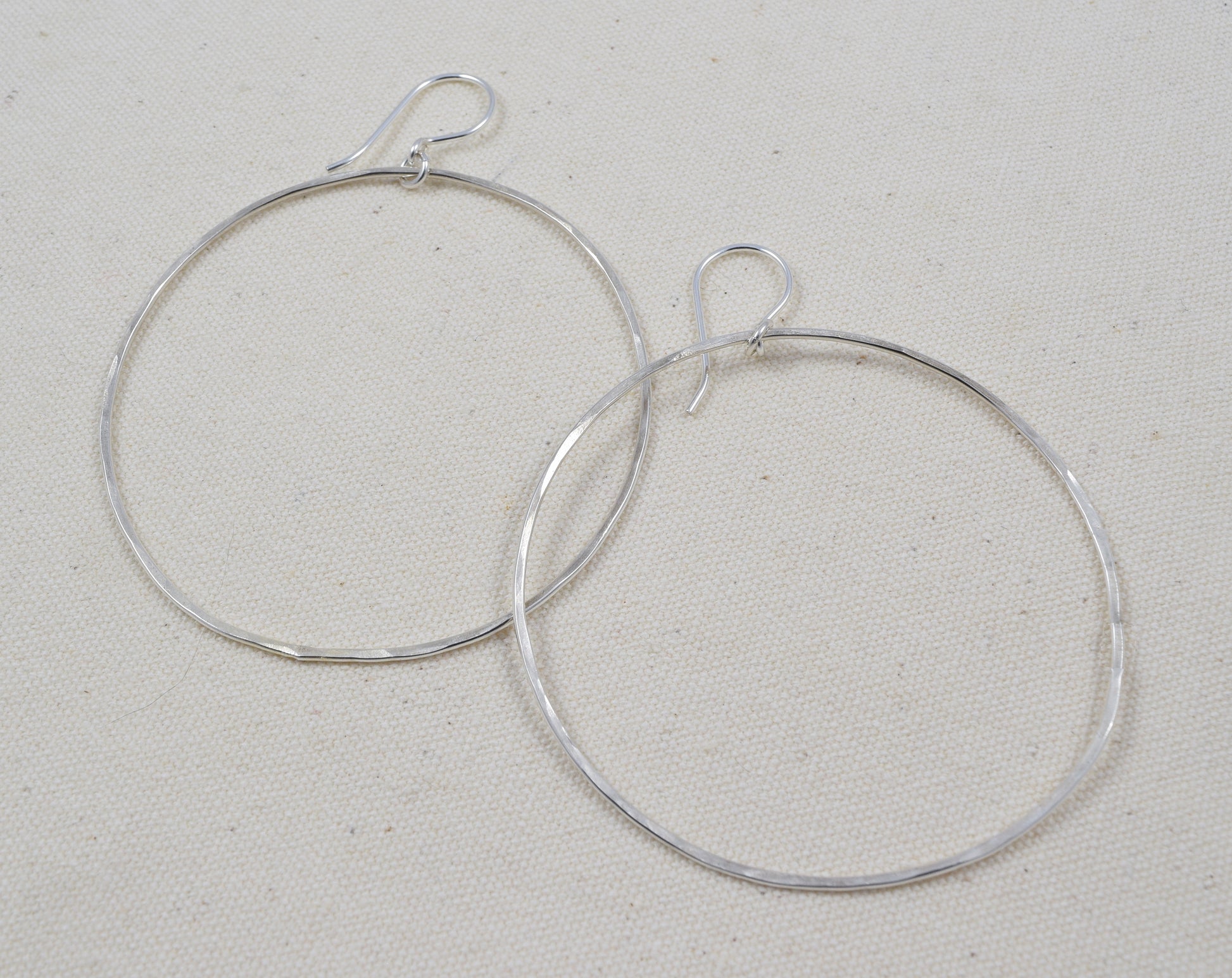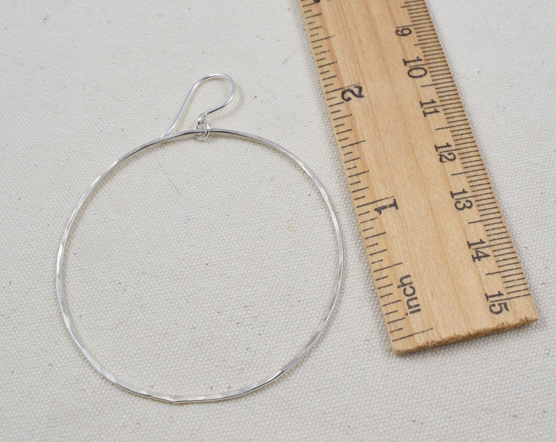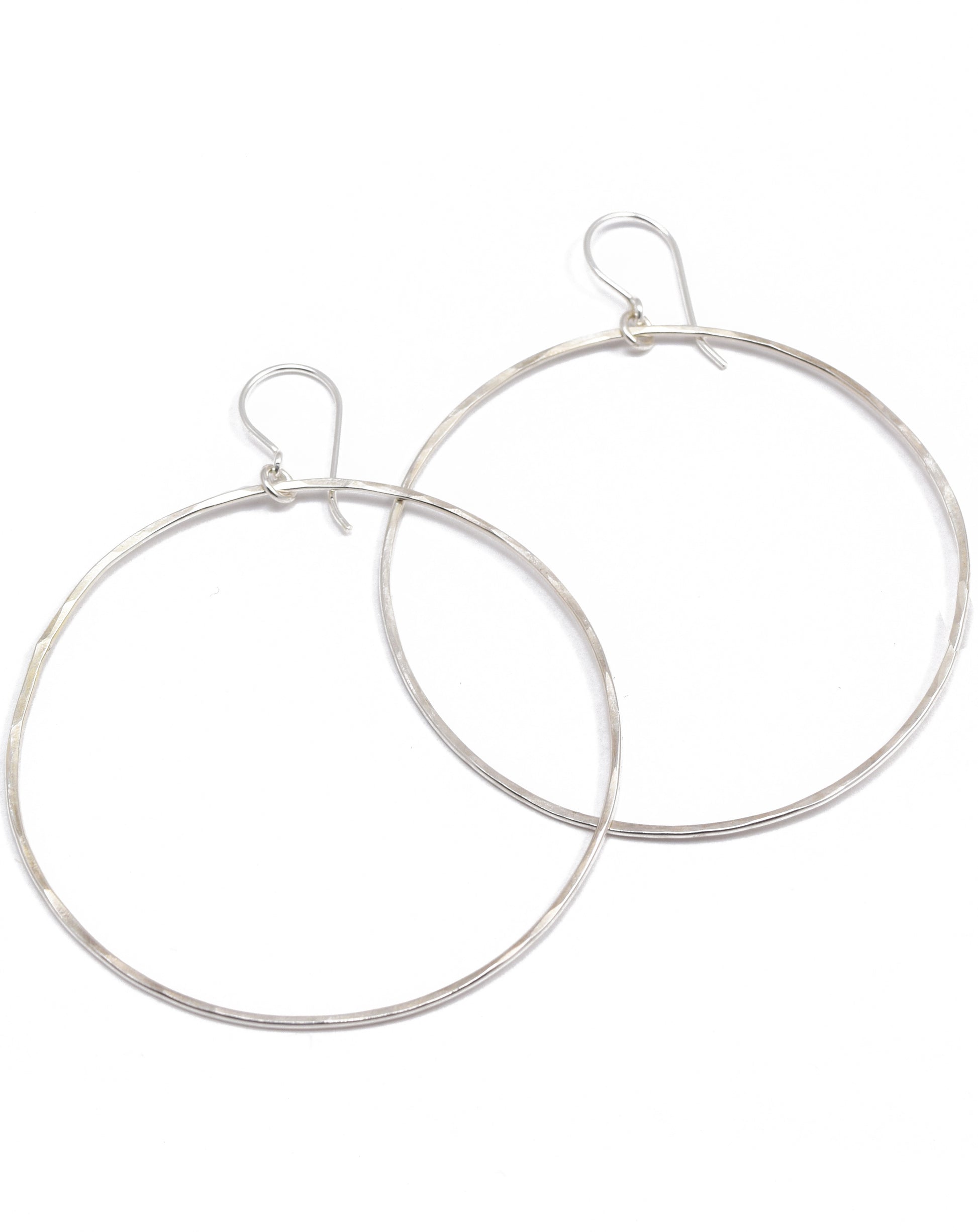 You might think that metal hoop earrings with a 2-inch (5 cm) diameter would be heavy and cumbersome in your ear, but not with the halo hoop earrings! Astonishingly lightweight, the earrings are made of hammered sterling silver and are attached to small French hoops. Total length is 3 inches (7.5 cm).