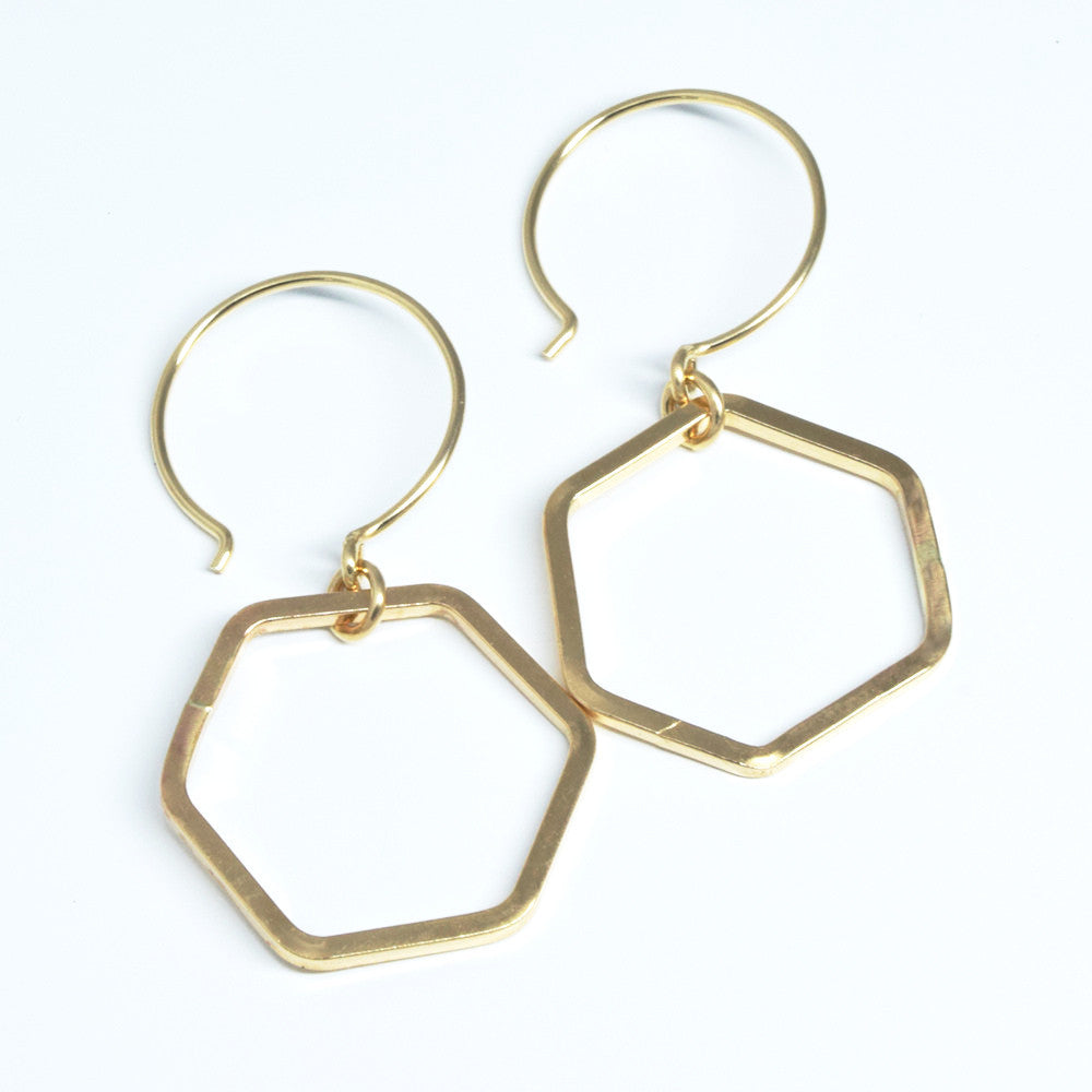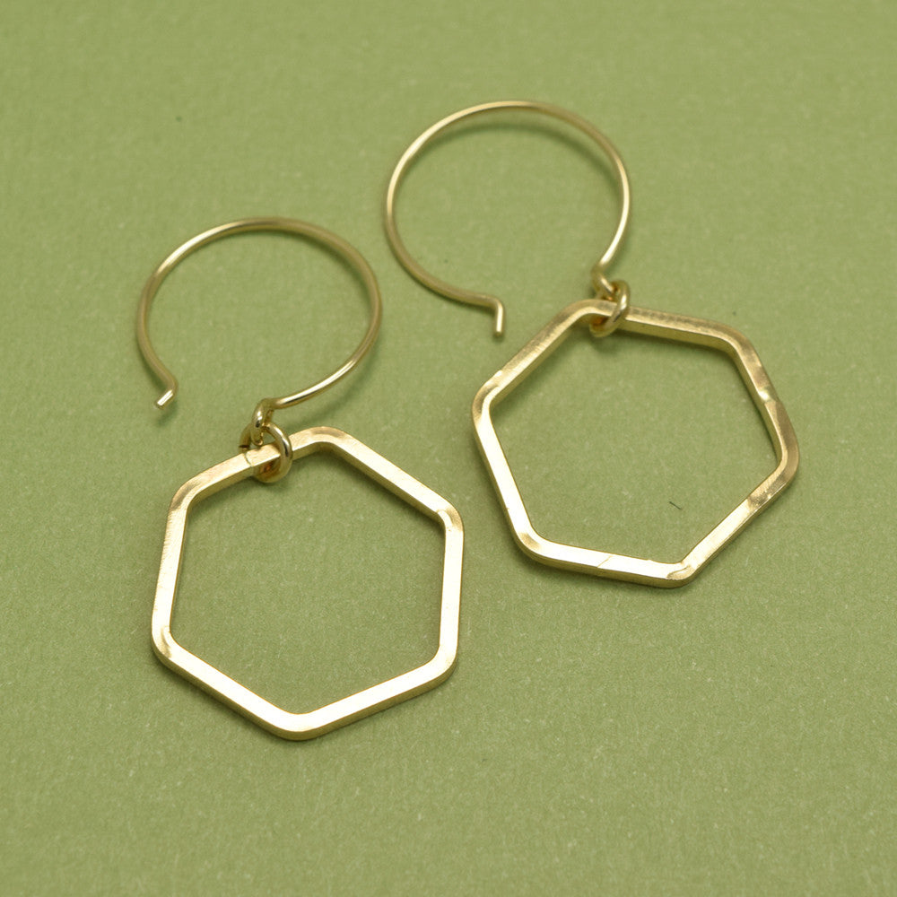 Small, 14K gold filled honeycomb-shaped hexagons are slightly chunky and hang about 1-1/4 inches (3.2 cm) from gold filled French hoops.