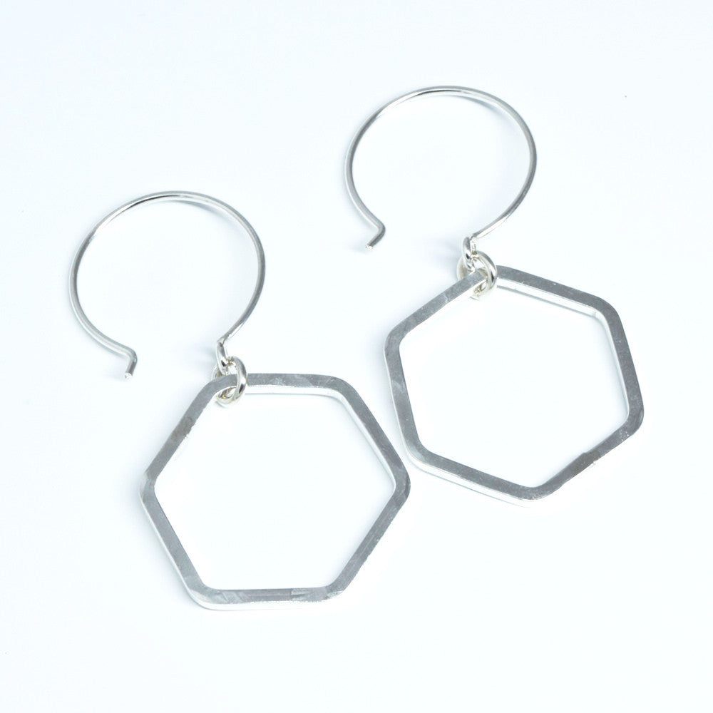 Small, sterling silver honeycomb-shaped hexagons are slightly chunky and hang about 1-1/4 inches (3.2 cm) from sterling silver French hoops.