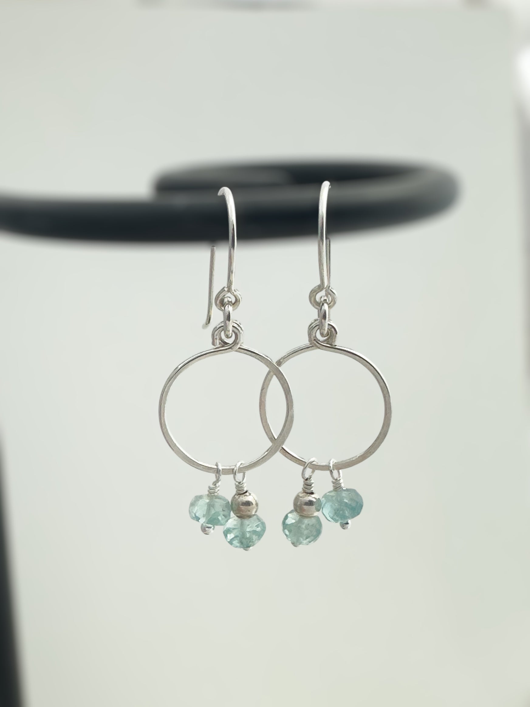Enhance your everyday style with these exquisite handcrafted sterling silver earrings. Designed for women who appreciate understated elegance, these dainty earrings feature a delicately hammered ½-inch silver circle, creating a subtle shimmer with every movement. Suspended from the circle are 4mm faceted gemstones, adding just the right touch of color and sophistication.  The earrings hang 1-1/2 inches from sterling silver earwires.