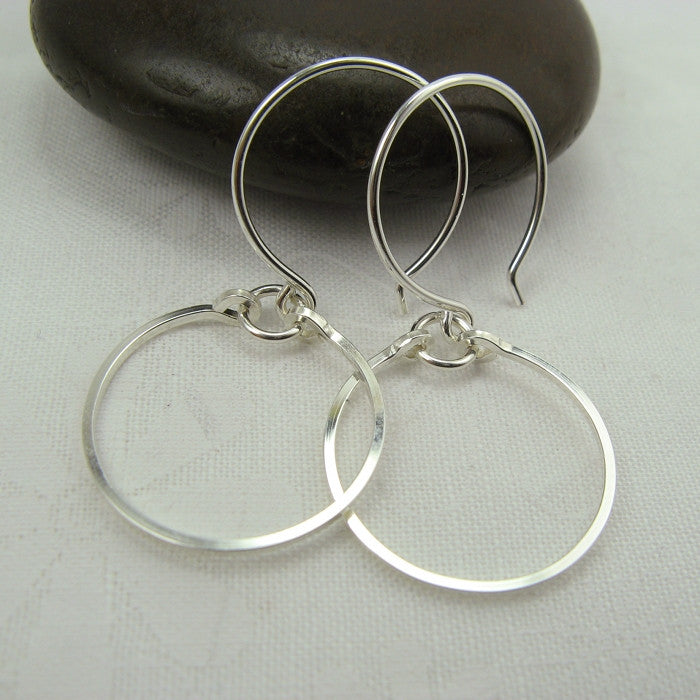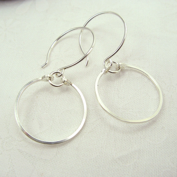 T-Shirt Day Earrings! Small hoops in sterling silver hang 1-1/2 inches (3.8 cm) in length and the circle has a diameter of 3/4 of an inch (1.9 cm). Lightweight and delicate~