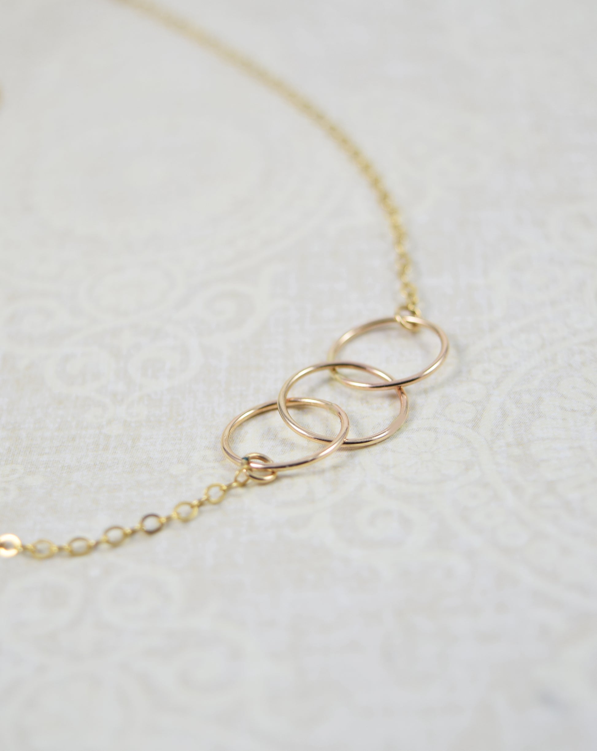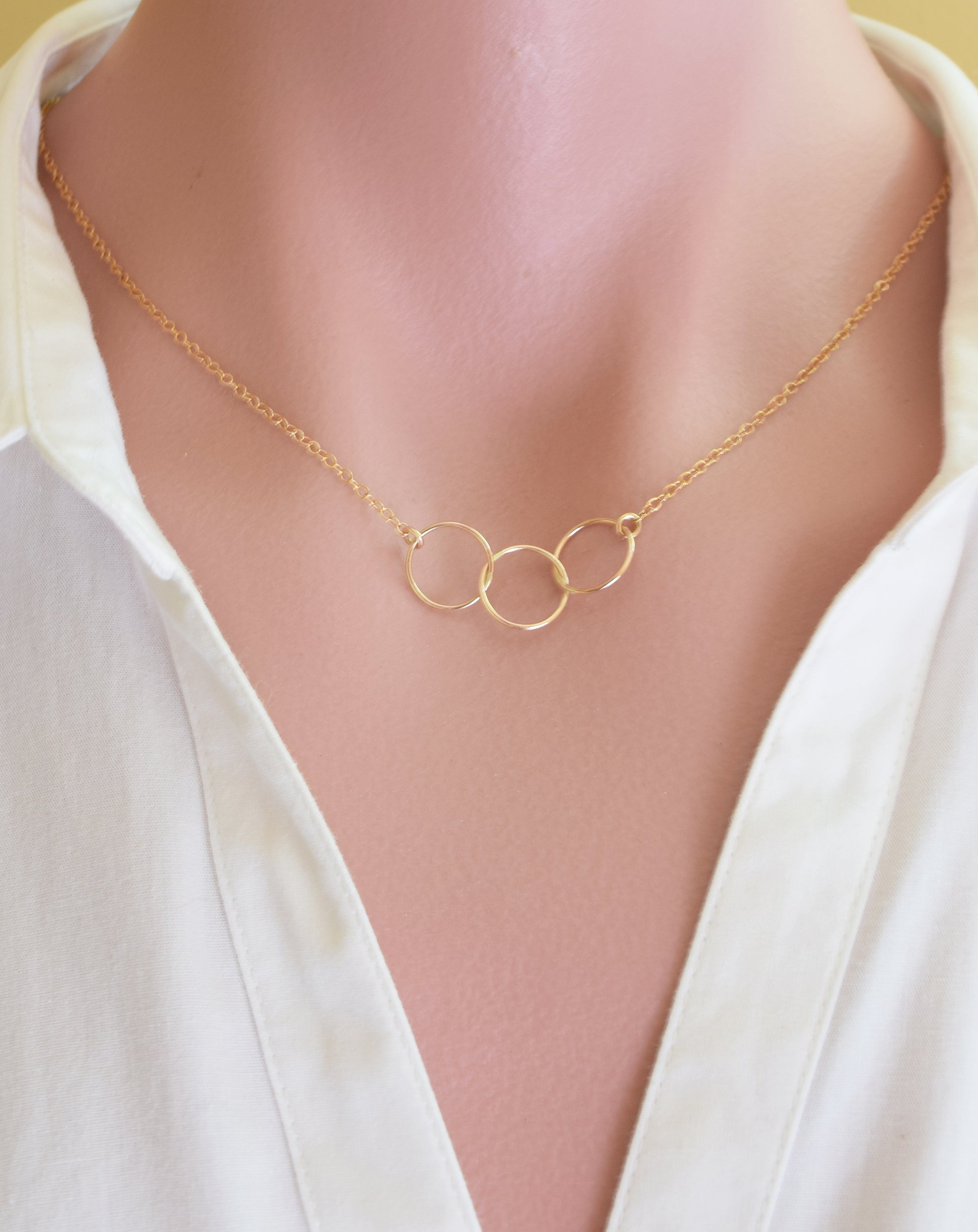 A beautiful gold necklace features a minimalist delicate design of three connected hoop pendants. The interlaced tiny circles form the focal point which displays lovely against the upper neck, somewhat looser than a choker collar, but still short for a necklace. Layer it for more length and presence or wear alone for a soft and light look.