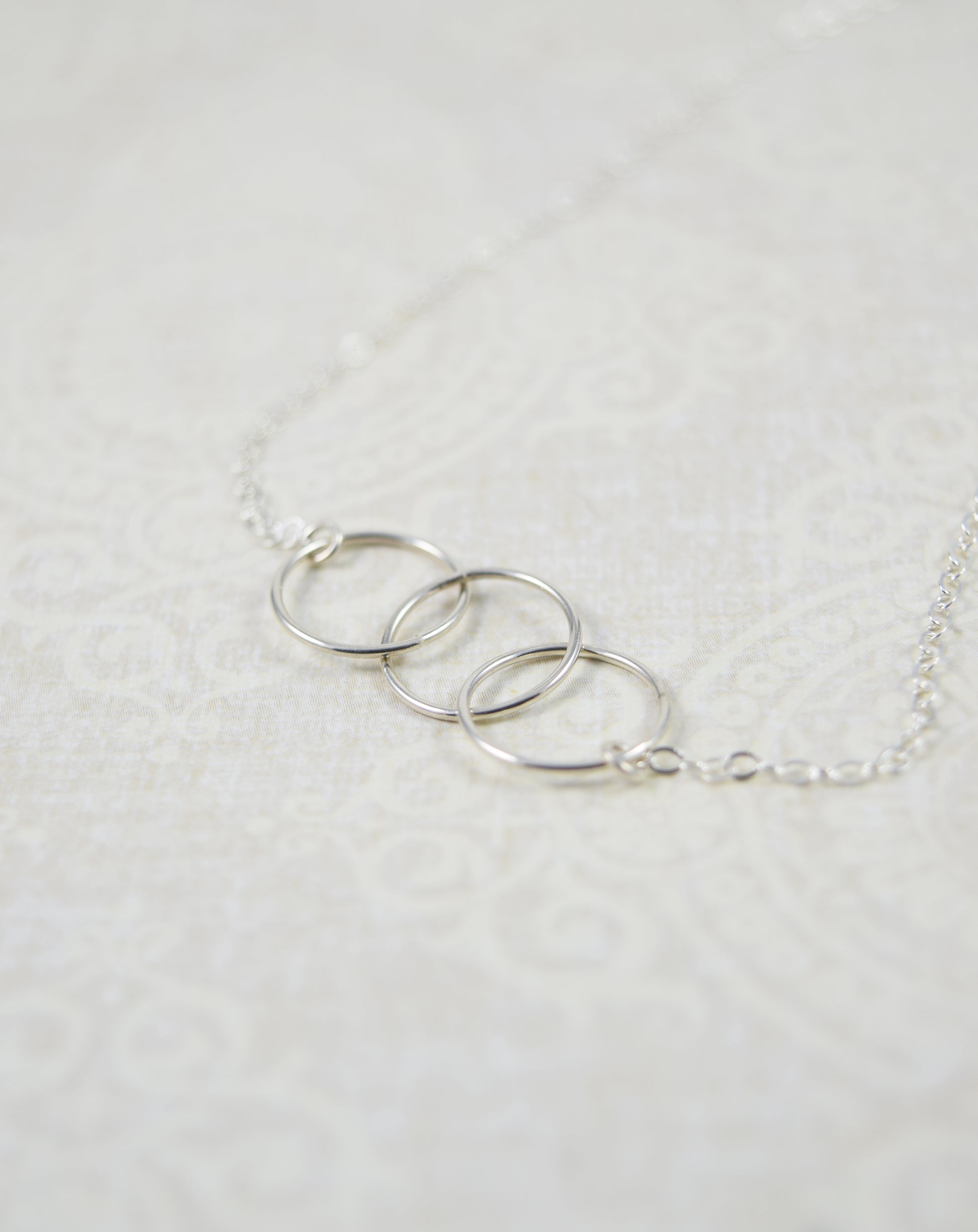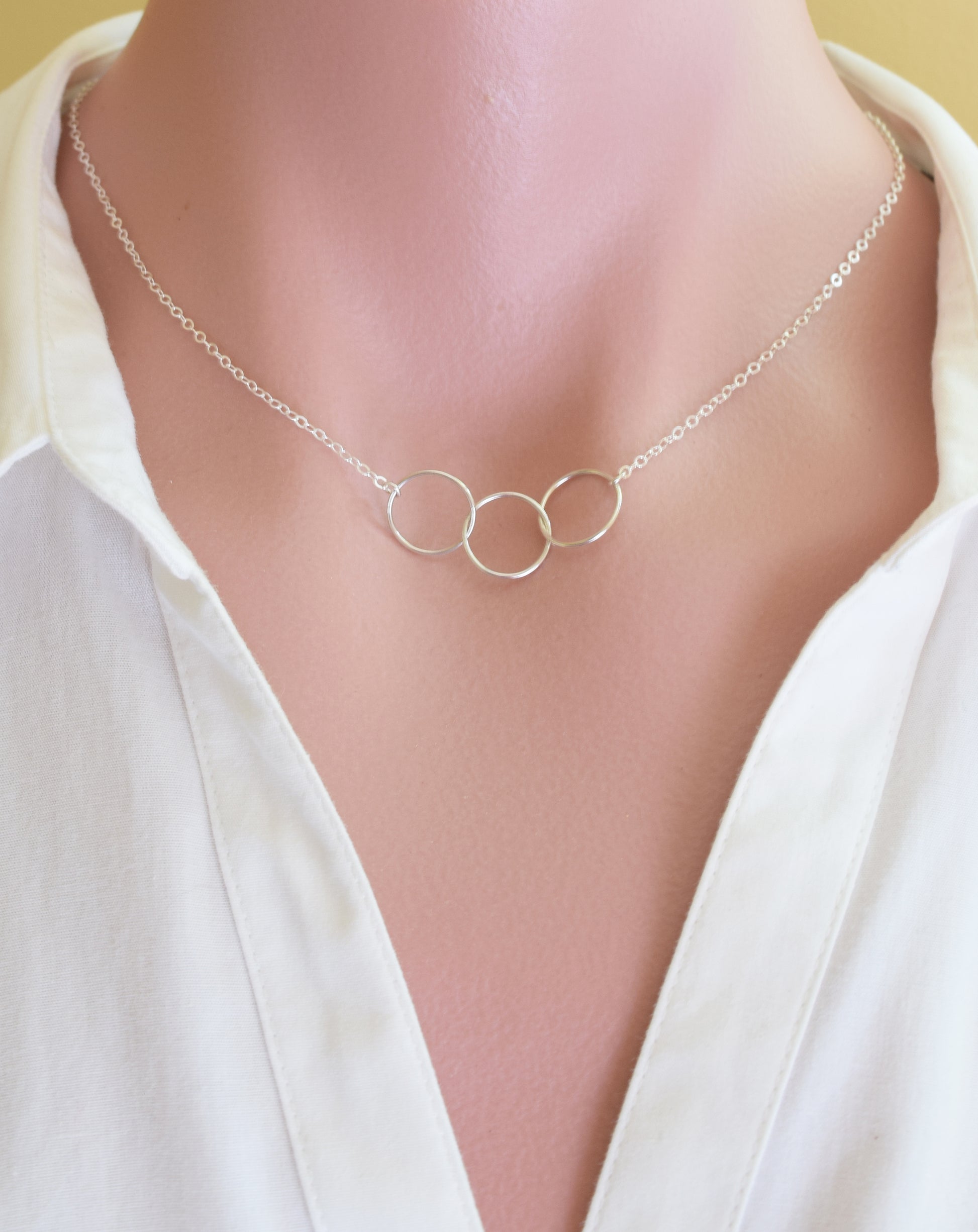 A beautiful sterling silver necklace features a minimalist delicate design of three connected hoop pendants. The interlaced tiny circles form the focal point which displays lovely against the upper neck, somewhat looser than a choker collar, but still short for a necklace. Layer it for more length and presence or wear alone for a soft and light look.