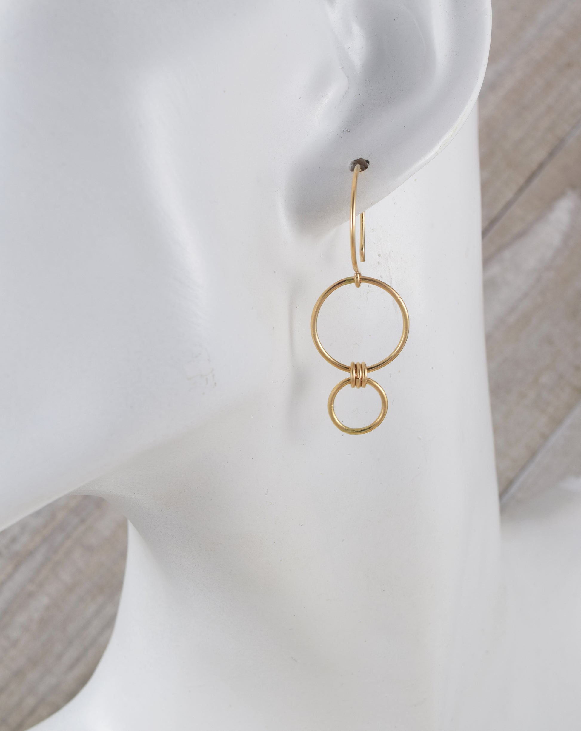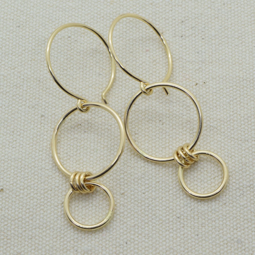 Large silver circle measures 12mm in diameter with a smaller 7mm circle attached. French hoop ear wires have a 1/2" diameter; 14K Gold filled.