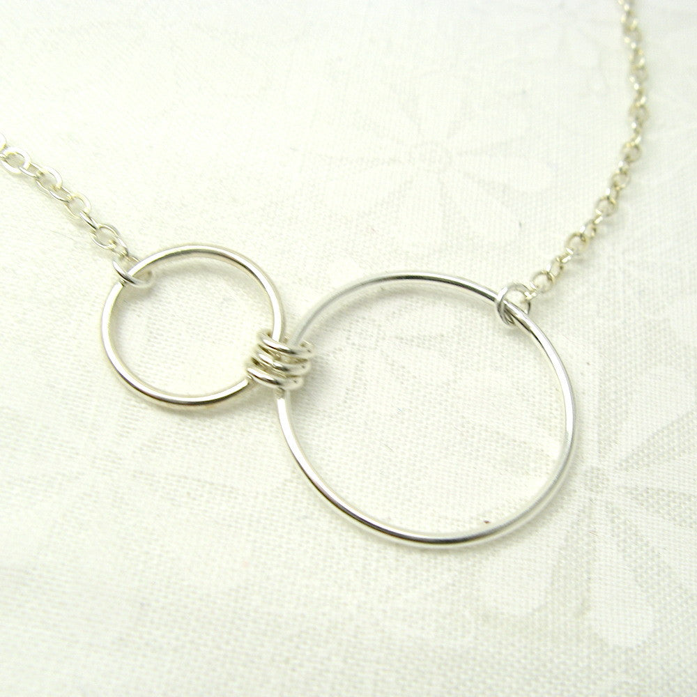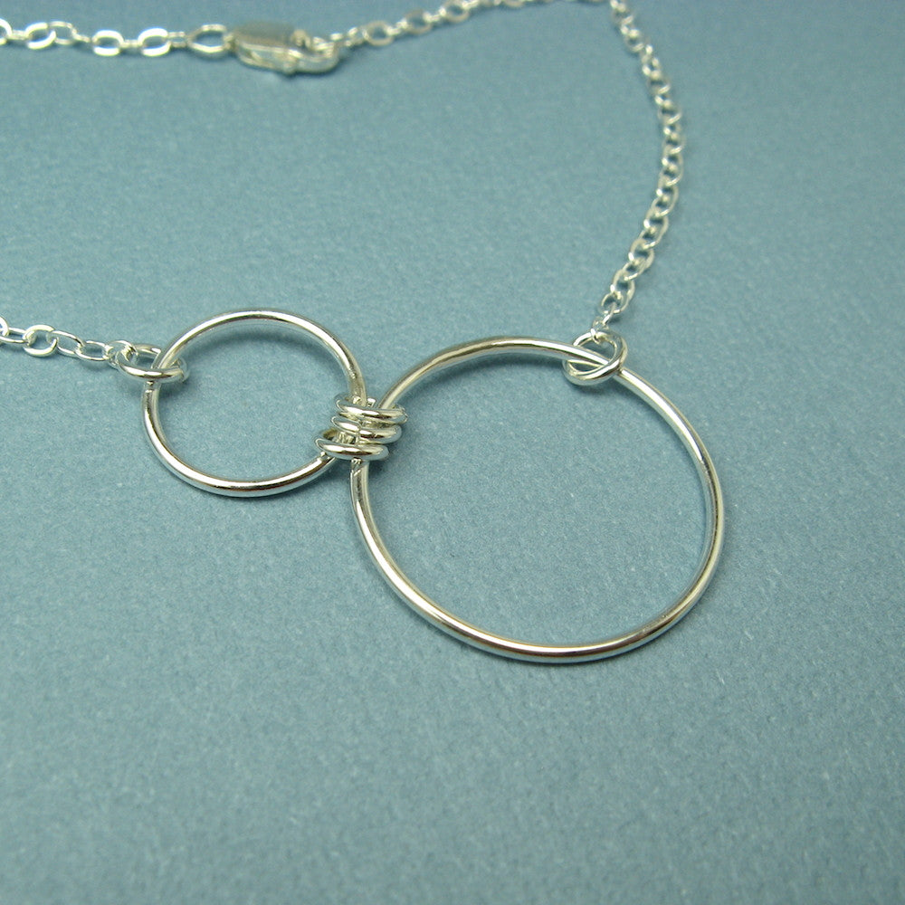 With its simplistic design of concentric circles linked together, the nexus necklace will become a favorite part of your everyday wardrobe! Sterling silver circles combined in various sizes create an attractive centerpiece that hangs from a cable chain. Circles are 15mm and 9mm. Please choose your size preference of 16, 18 or 20 inches. Sterling silver.