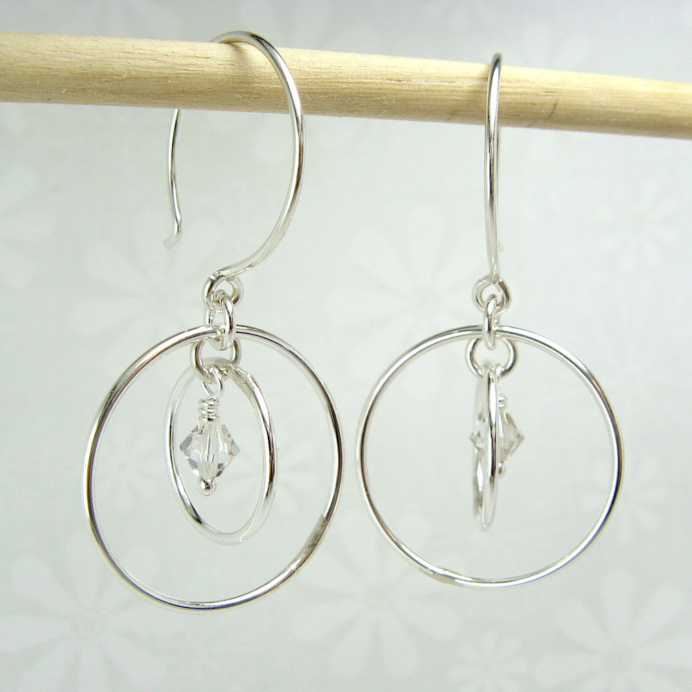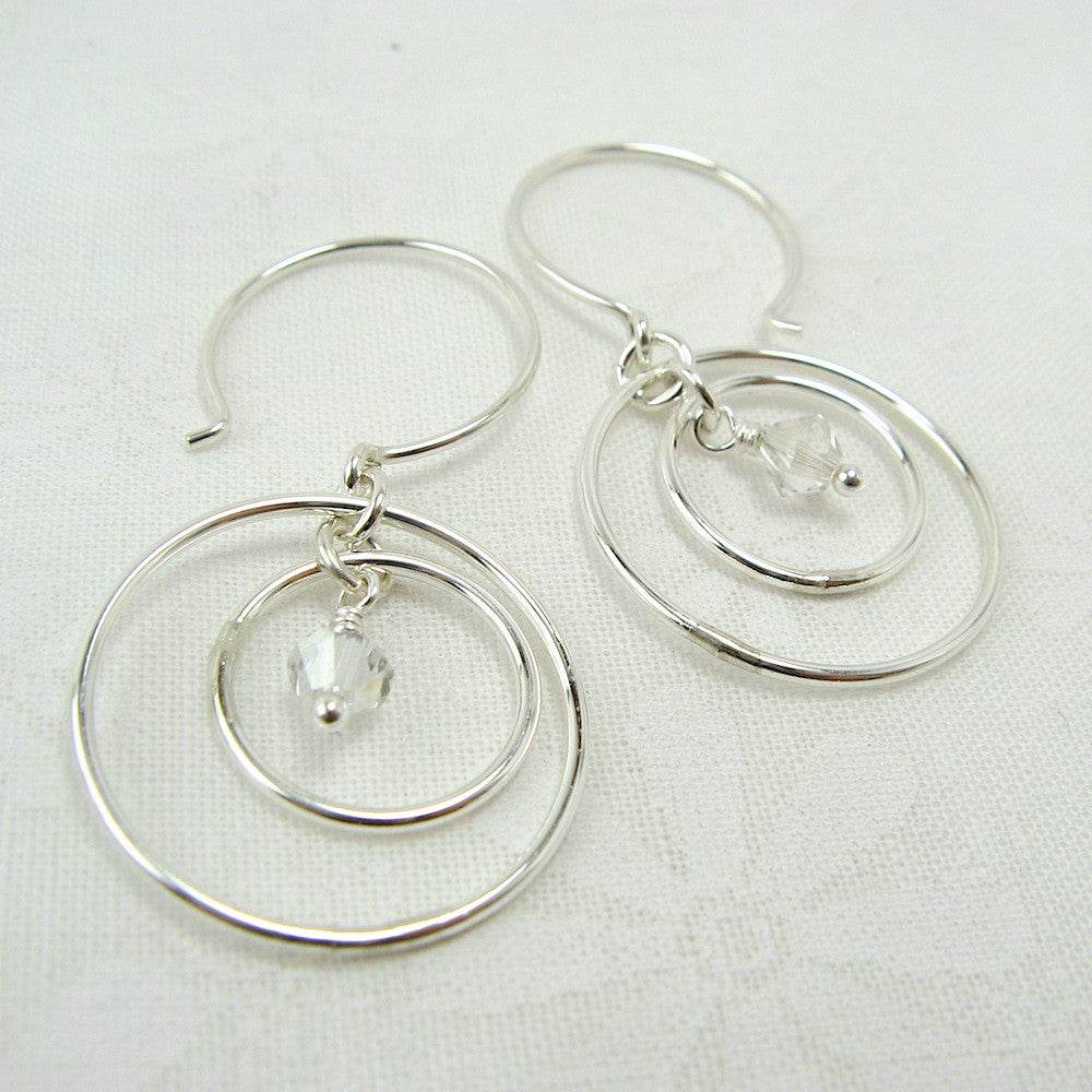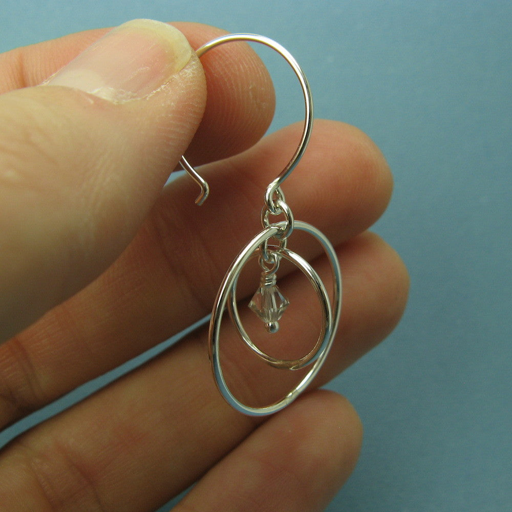 Dainty, little galaxy earrings are made of sterling silver rings and create lots of movement but are incredibly lightweight. The large outer ring has a diameter of 3/4" (2cm) and total length is about 1-1/2" (3.8cm). 4mm crystal beads add a bit of sparkle.