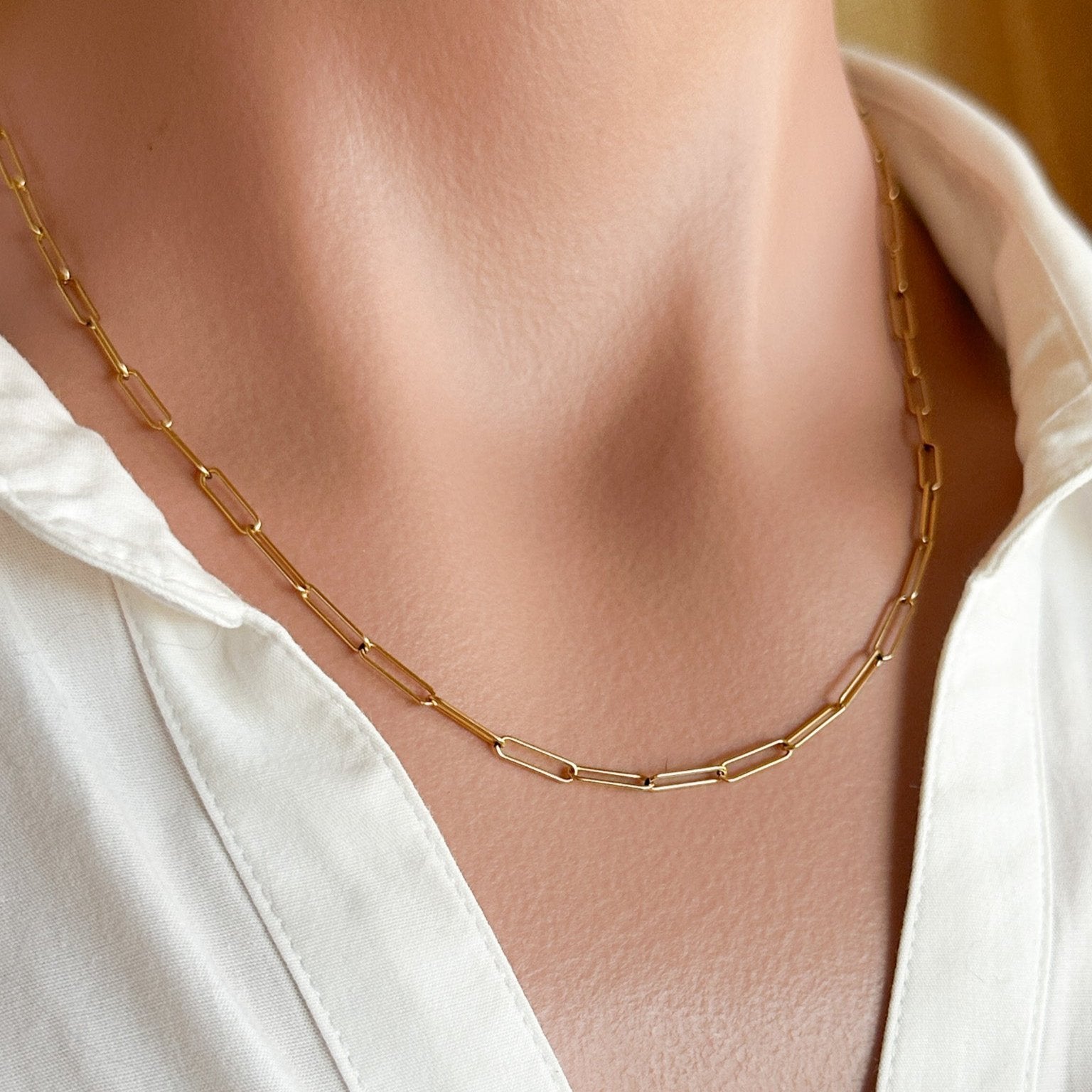 The newest trend in chains, the paper clip chain necklace adds a sophisticated element to both your day and evening look.  This chain is perfect for layering with pendant necklaces or simply alone.