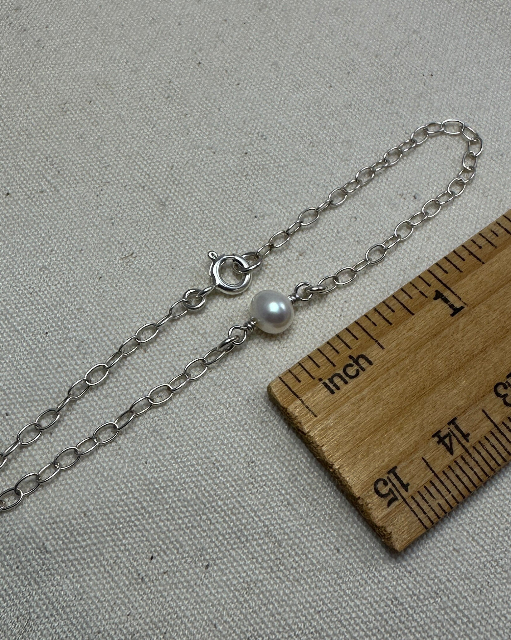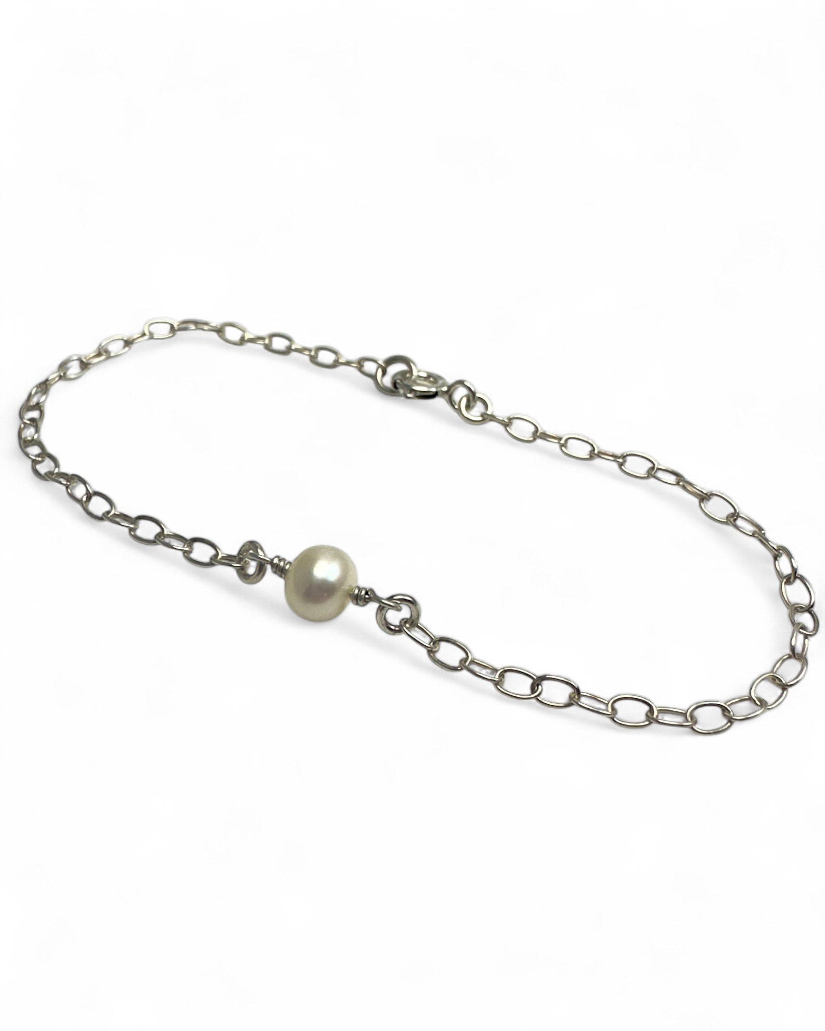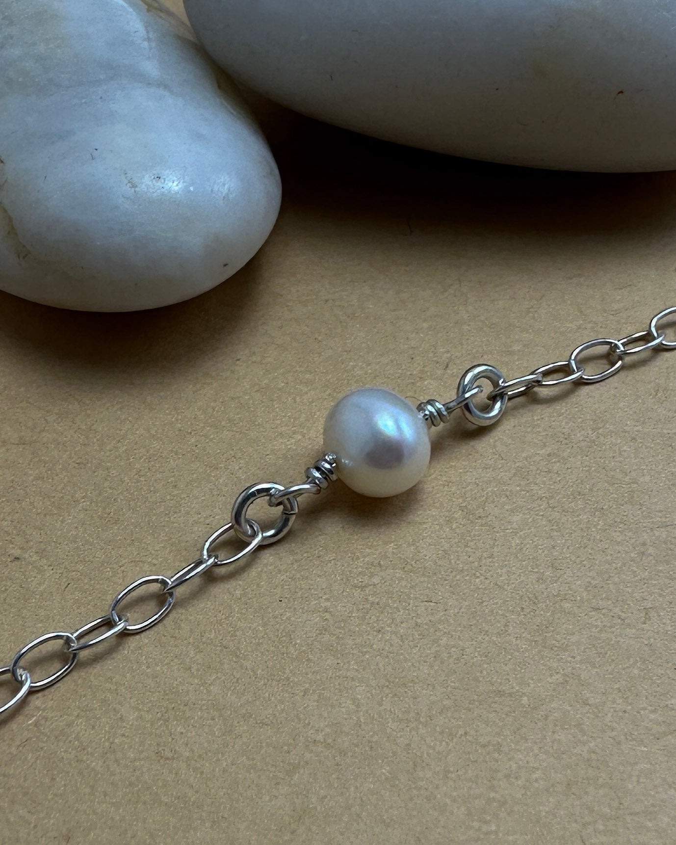 This delicate sterling silver chain bracelet features a single 6mm freshwater pearl—gently luminous, quietly elegant, and sized just right for everyday wear. Designed to be worn as either a bracelet or an anklet, its minimalist silhouette layers beautifully with your favorite pieces, making it a versatile addition to your jewelry collection.