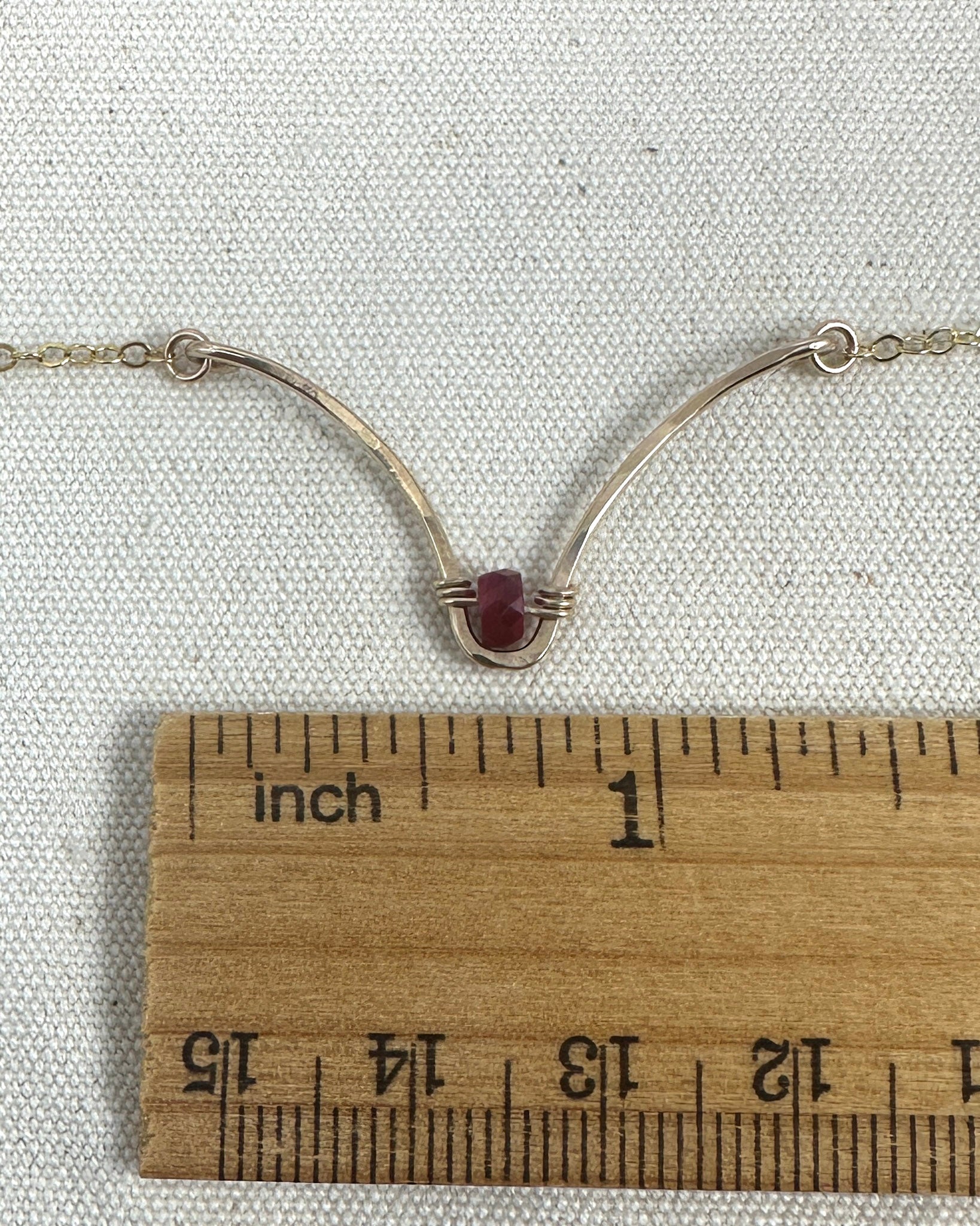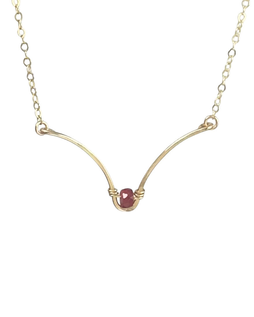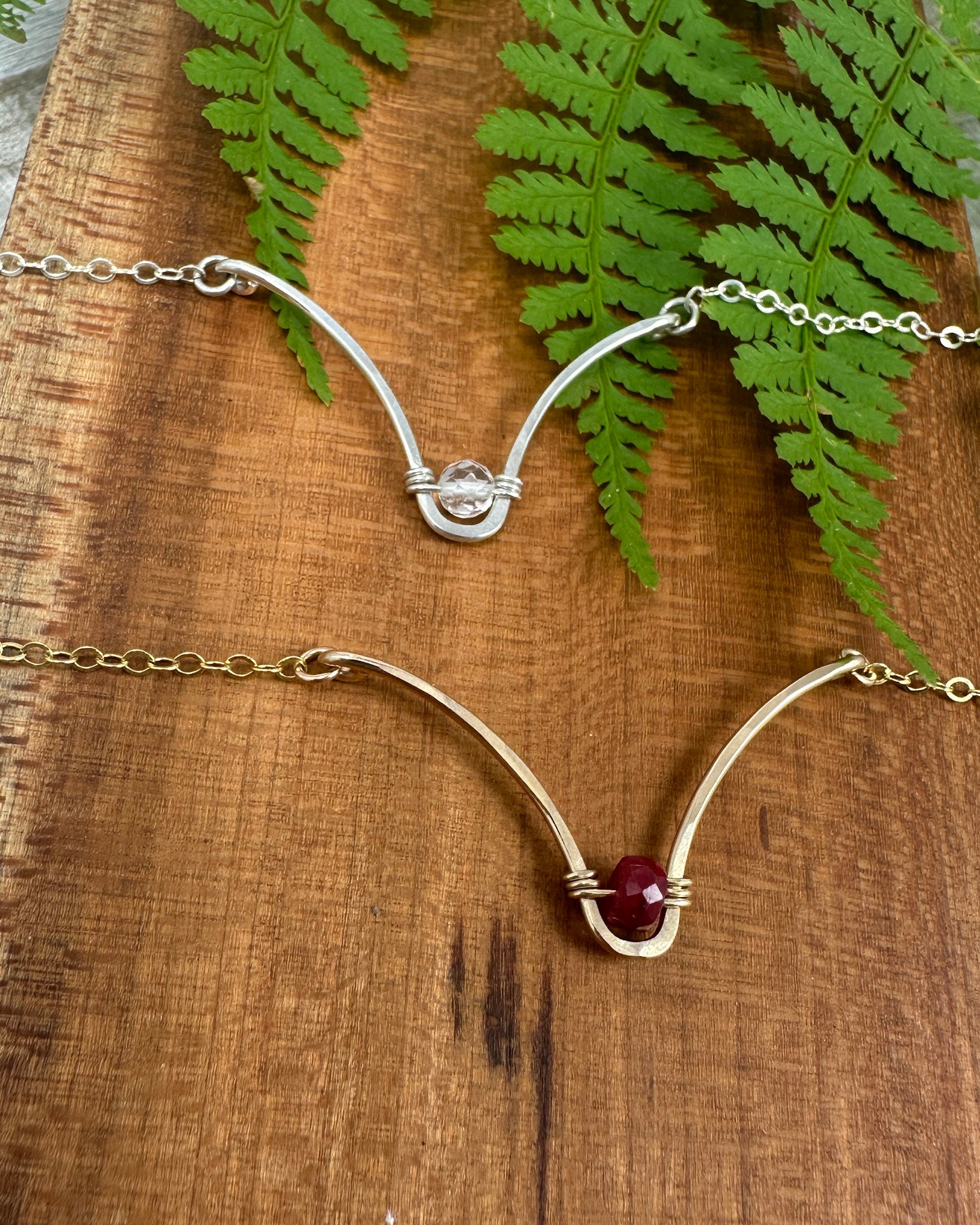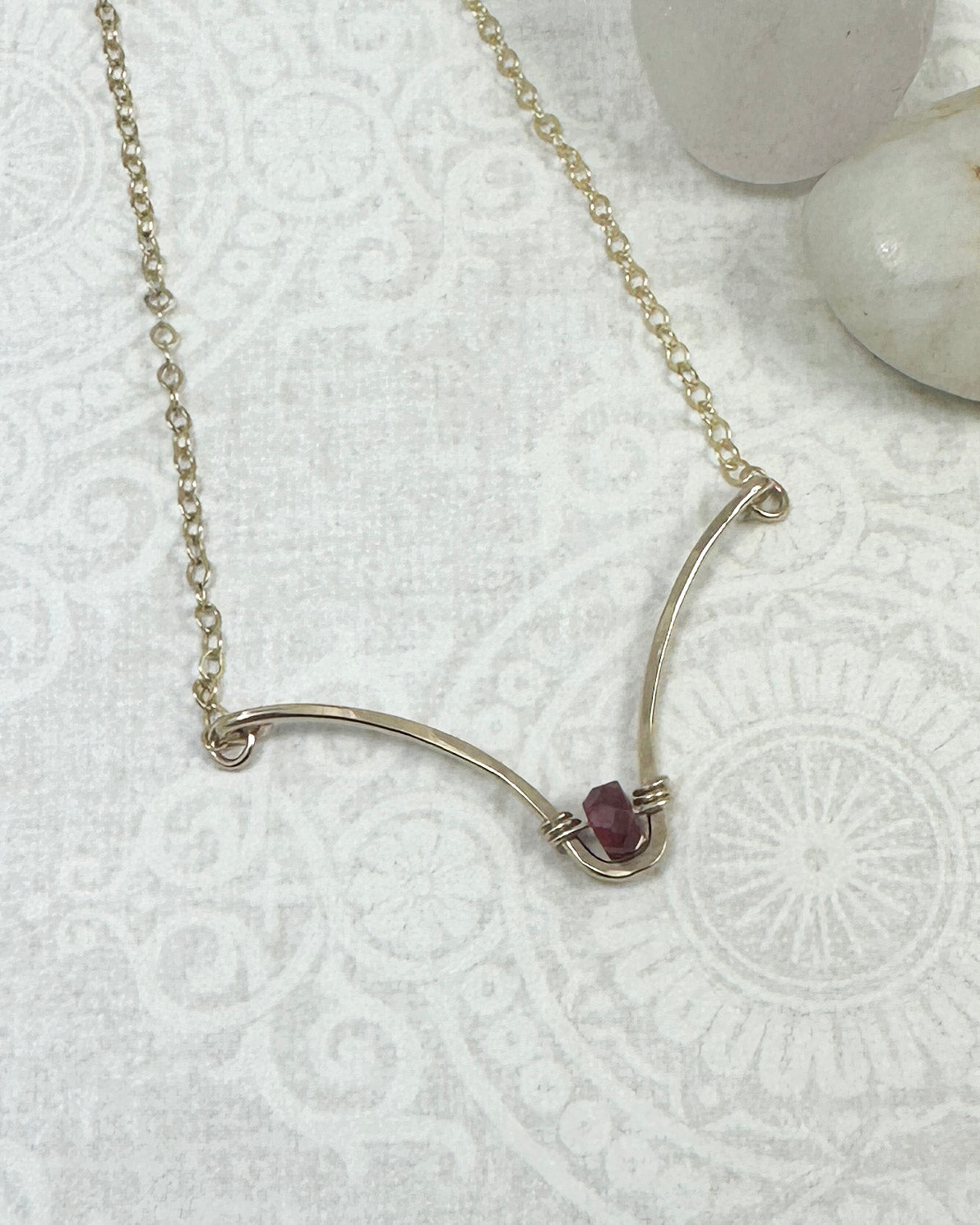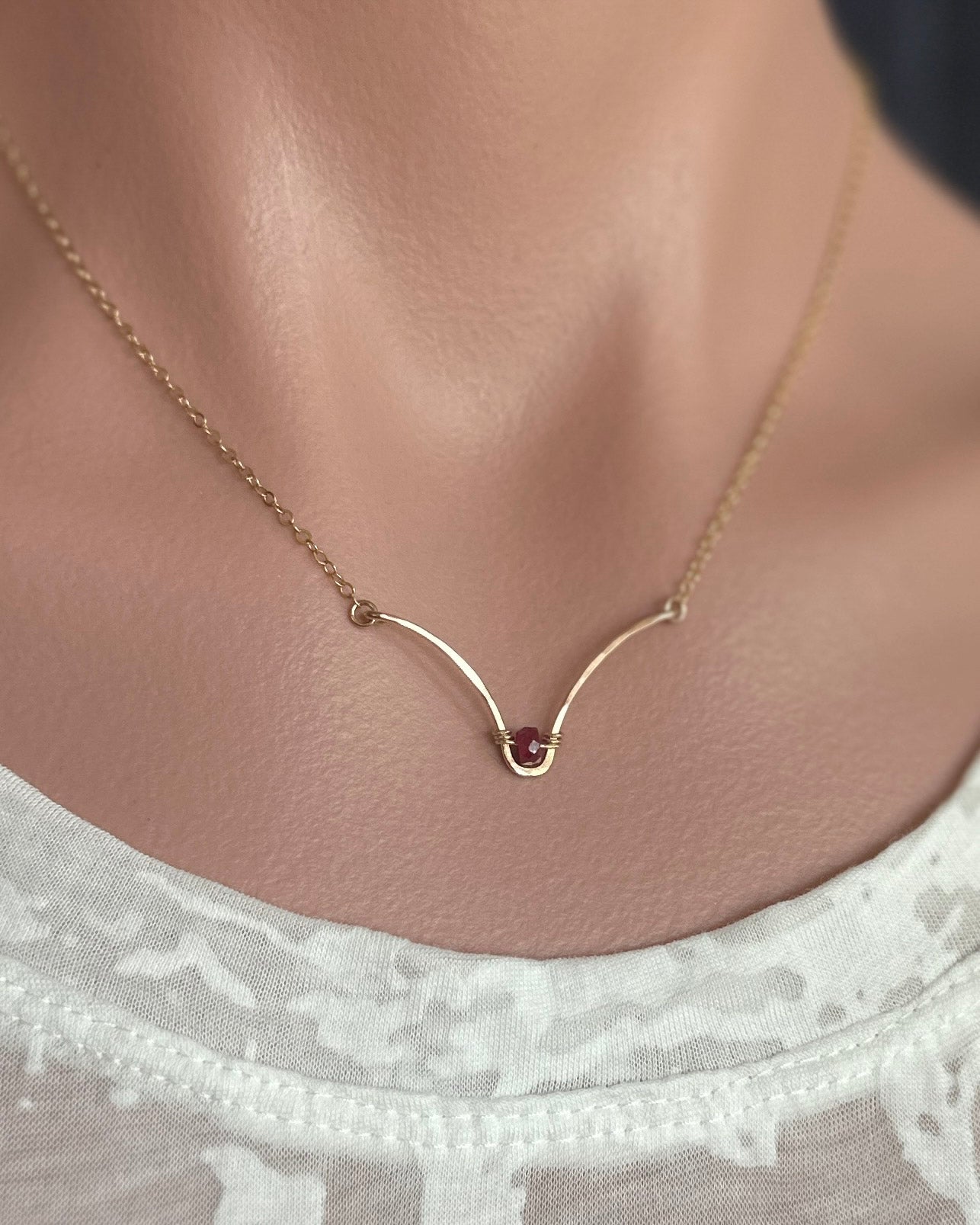 Each necklace is handcrafted in lightly hammered 14K gold-filled and can be adorned with a small gemstone at its center. Whether you choose your own birthstone, a loved one’s, or simply your favorite color, this necklace becomes uniquely yours.