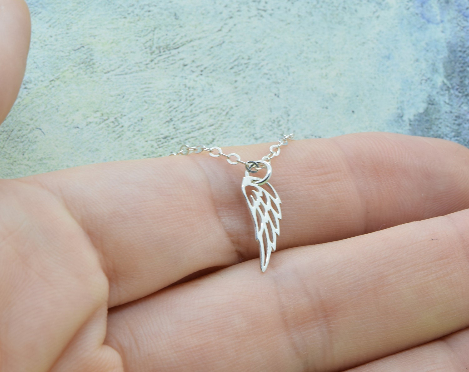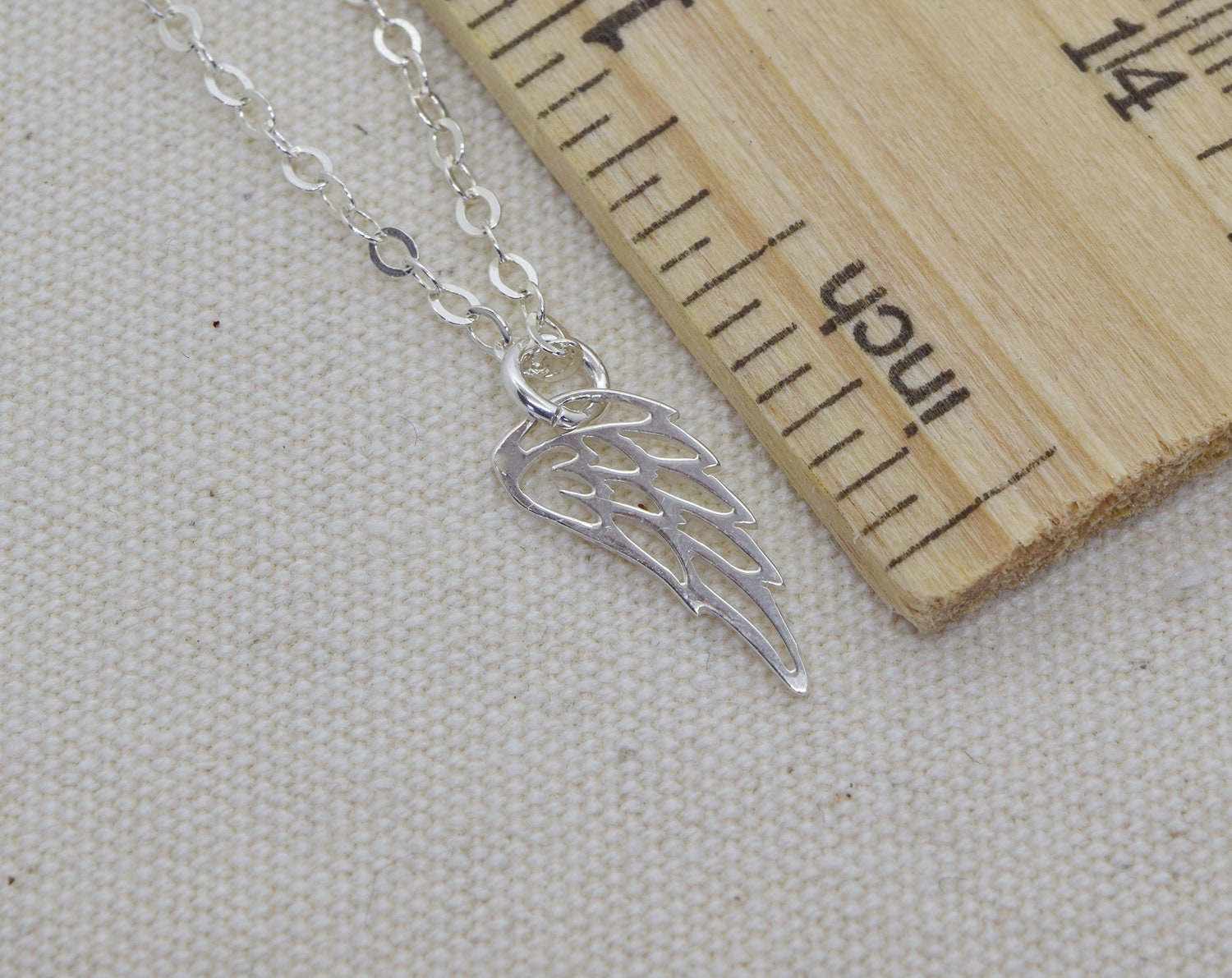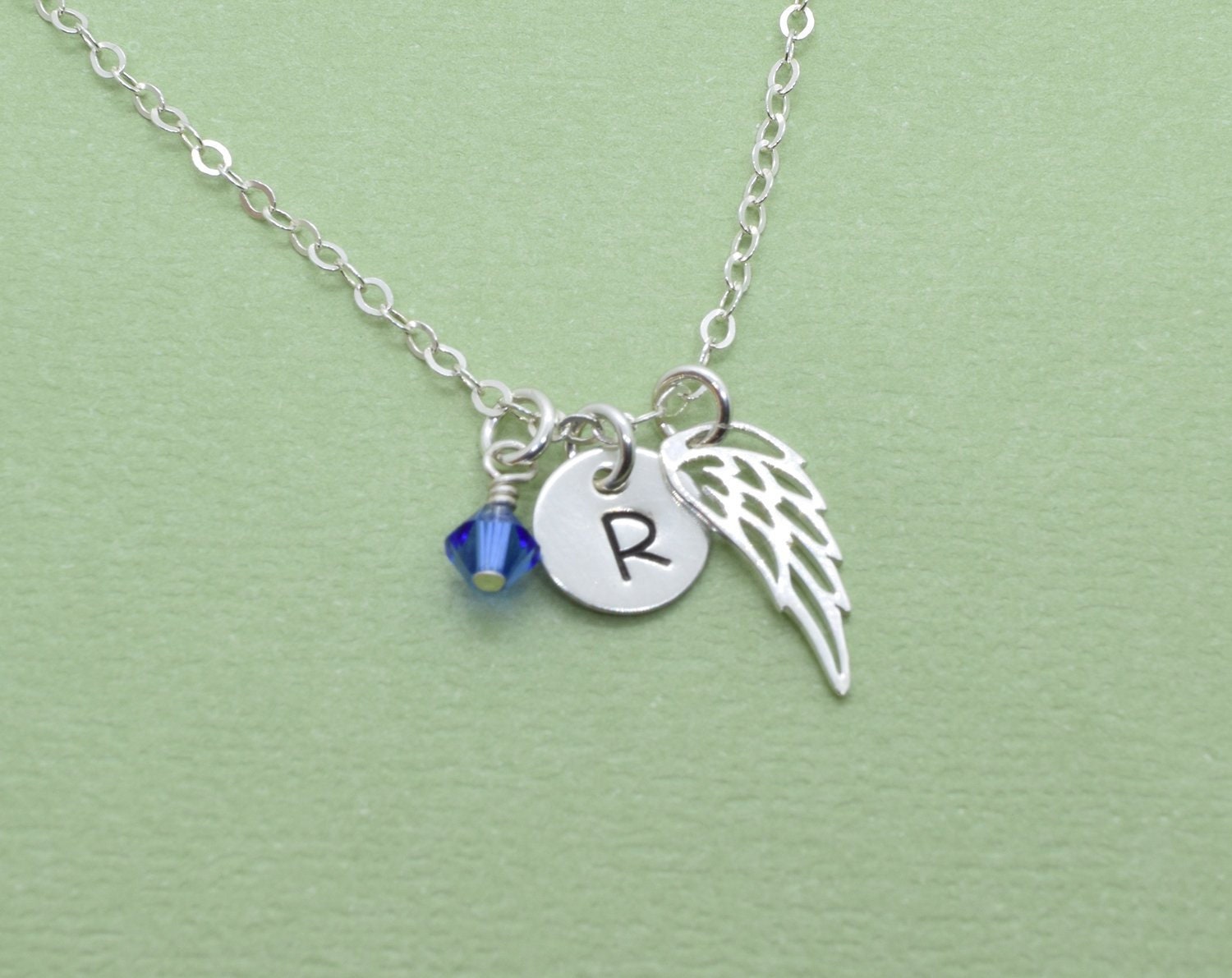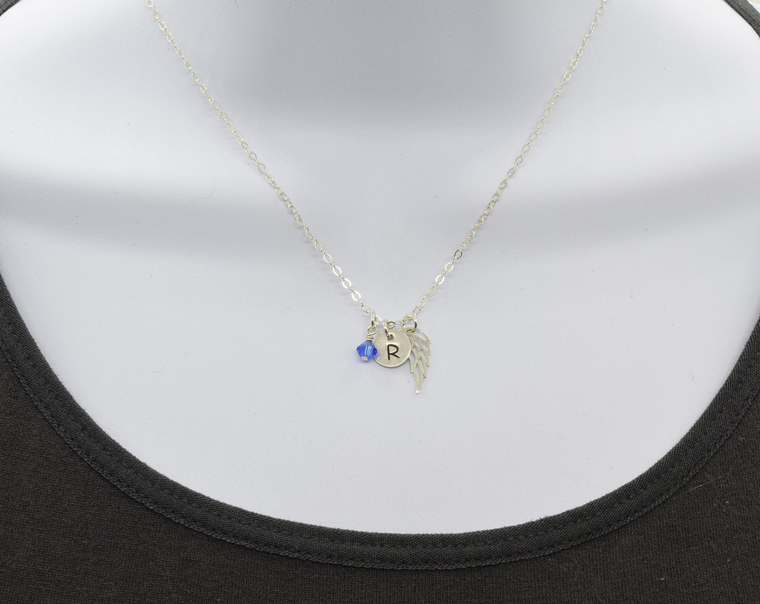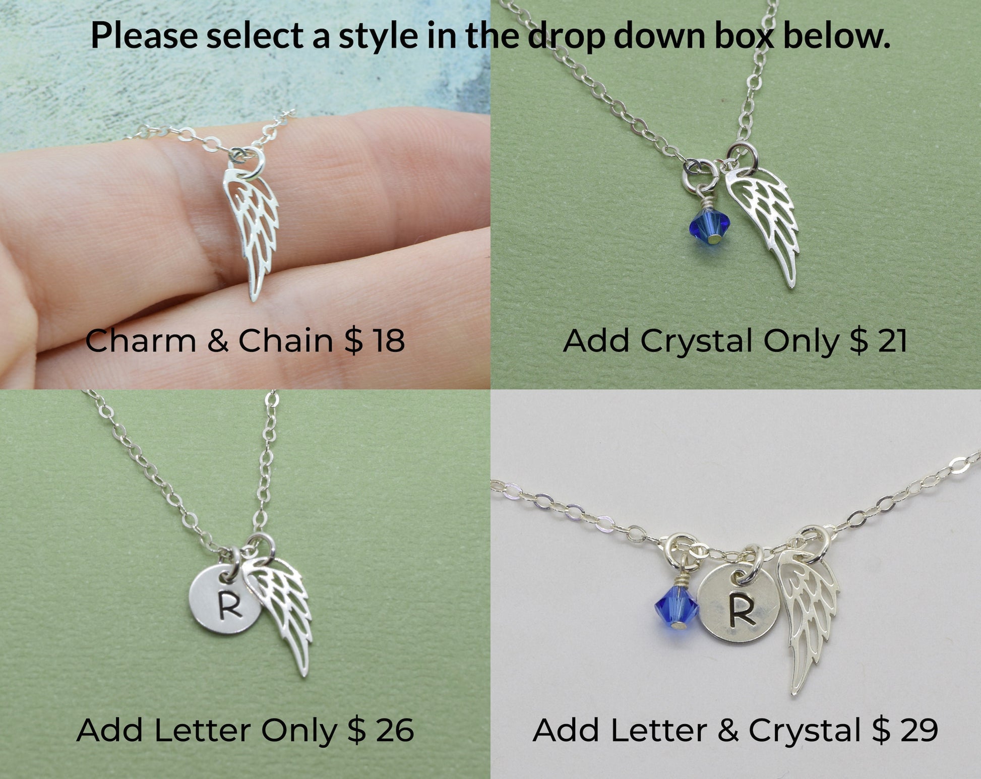 Hold the memory of your loved one close to your heart with a dainty Angle Wing Charm Necklace. The angel wing is VERY DAINTY at 15mm (1/2 in). Available as a simple charm on a chain or personalize it and add an Initial and/or Birthstone.