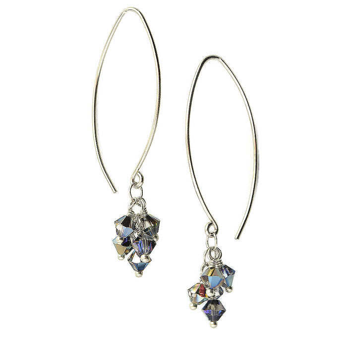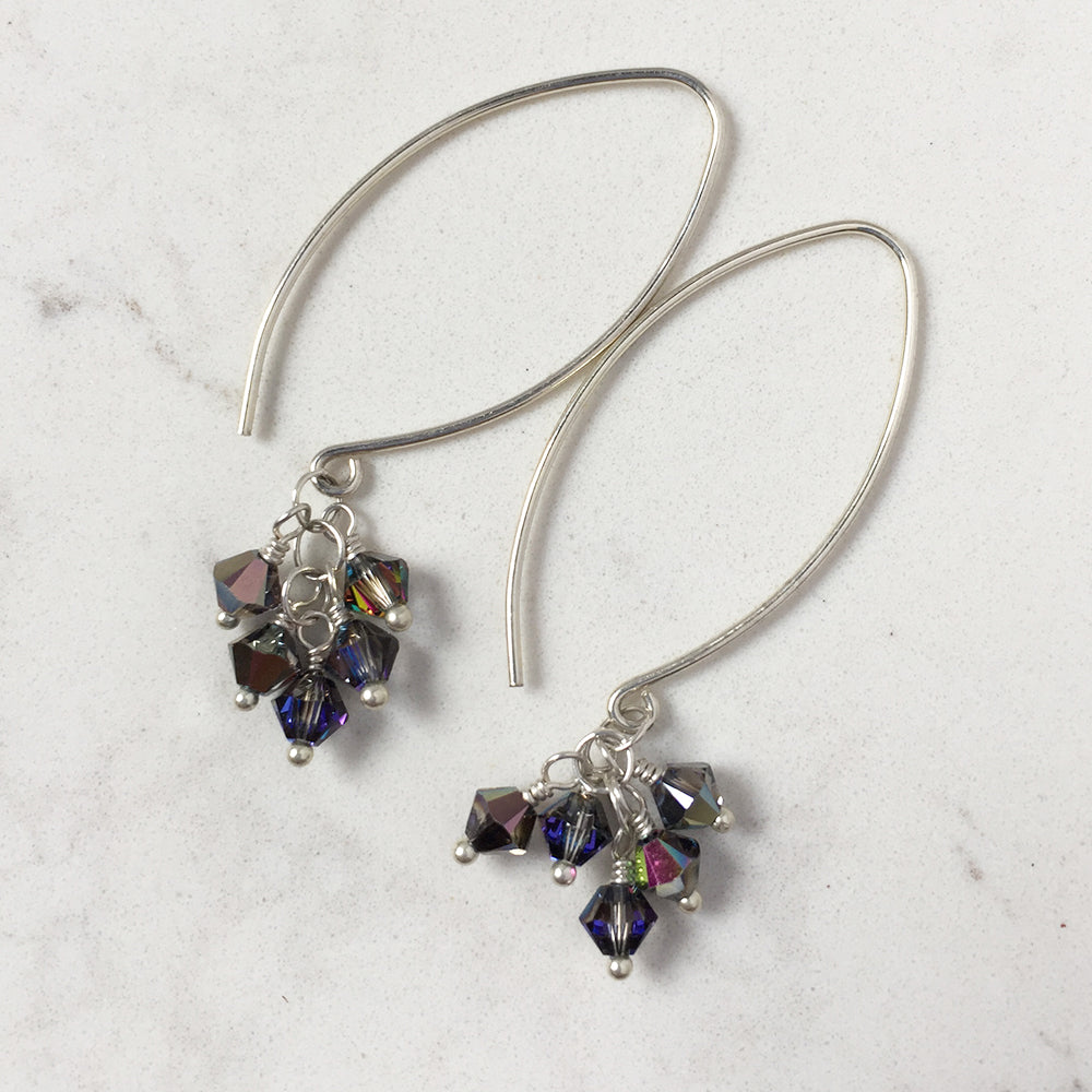 My eyes, like most females, will always be turned by anything sparkly and crystals are one of the most sparkly things you can imagine. The tassel earrings make the most of all that sparkle yet are dainty enough to add just a touch of sparkle to everyday. They hang about 2" on fish-shaped ear wires and are all sterling silver with dark iridescent crystals.