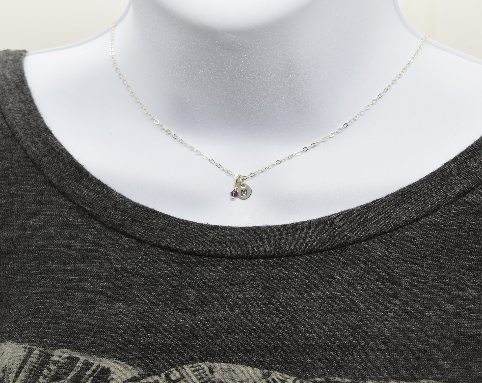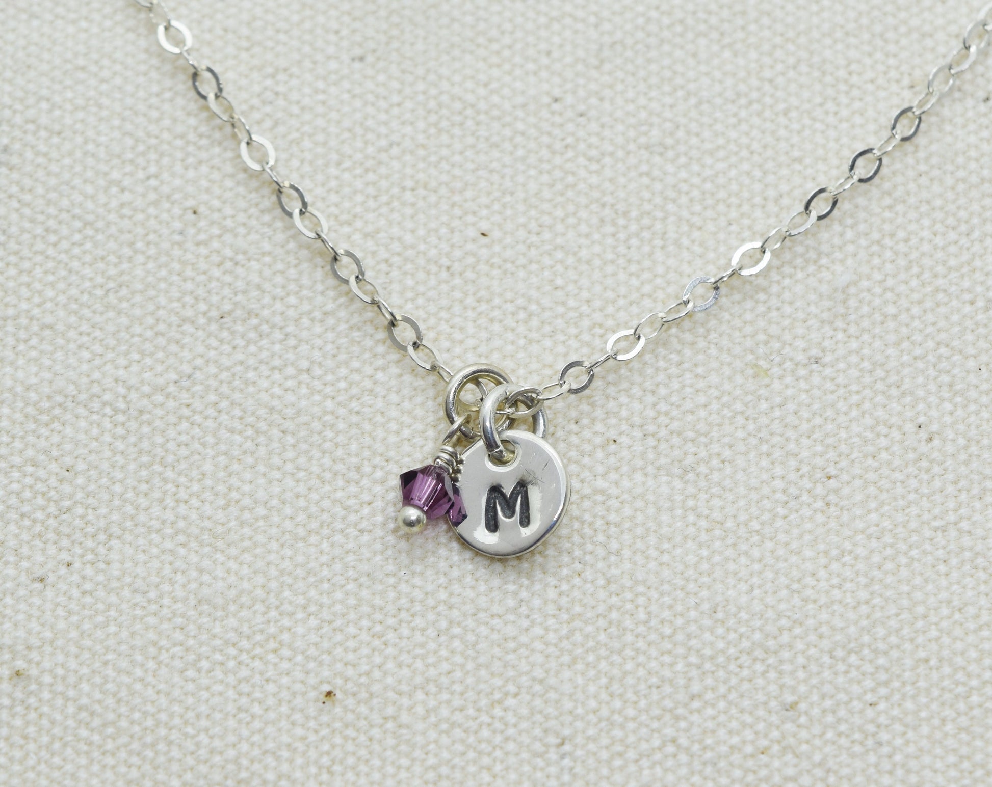 Tiny Silver Initial Necklace with Birthstone Crystal
