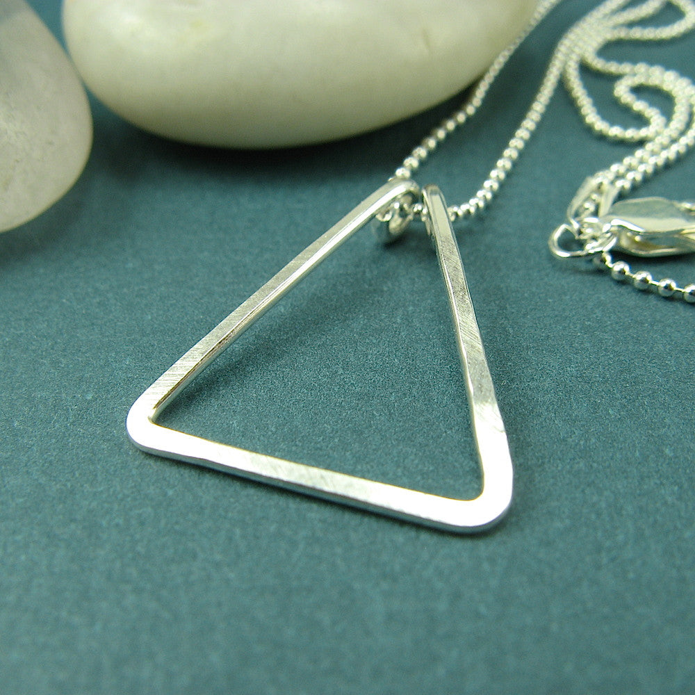 A small, elegant, lightly hammered, triangle hangs from your choice of 16, 18 or 20 inch cable or 1mm bead chain. The triangle measures 7/8" (2.25 cm) tall.