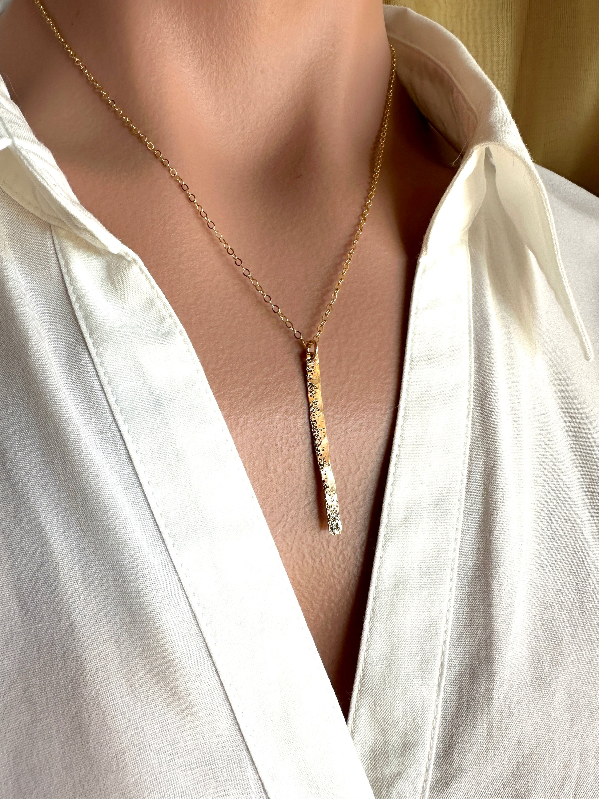 Gold-filled for lasting wear, this pendant blends style and durability. Its simple vertical design means it pairs beautifully with other jewelry, but it can also stand alone for a minimal-chic vibe.